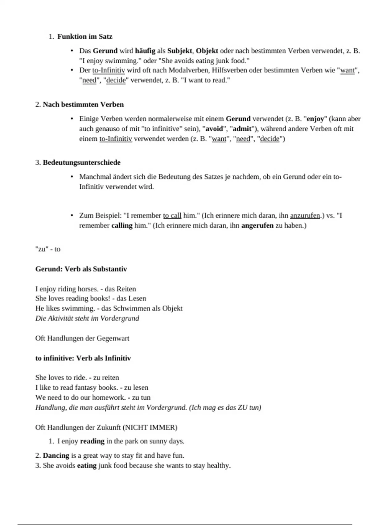 • Das Gerund wird häufig als Subjekt, Objekt oder nach bestimmten Verben verwendet, z. B.