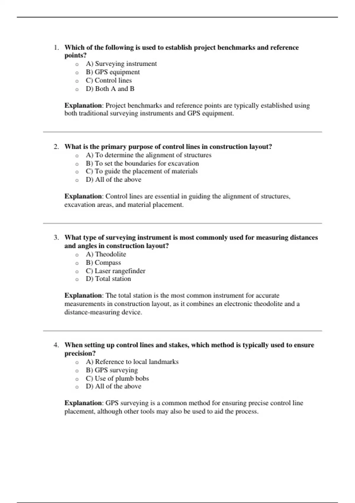 Explanation: GPS surveying is a common method for ensuring precise control line