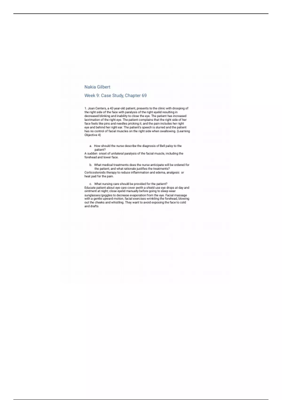 1. Joan Centers, a 42-year-old patient, presents to the clinic with drooping of