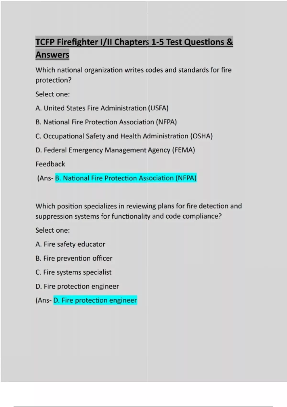 Which national organization writes codes and standards for fire protection? Select one: A. United States Fire Administration (USFA) B. National Fire Protection Association (NFPA) C. Occupational Safety and Health Administration (OSHA) D. Federal Emergency Management Agency (FEMA) Feedback (Ans- B. National Fire Protection Association (NFPA) Which position specializes in reviewing plans for fire detection and suppression systems for functionality and code compliance? Select one: A. Fire safety educator B. Fire prevention officer C. Fire systems specialist D. Fire protection engineer (Ans- D. Fire protection engineer