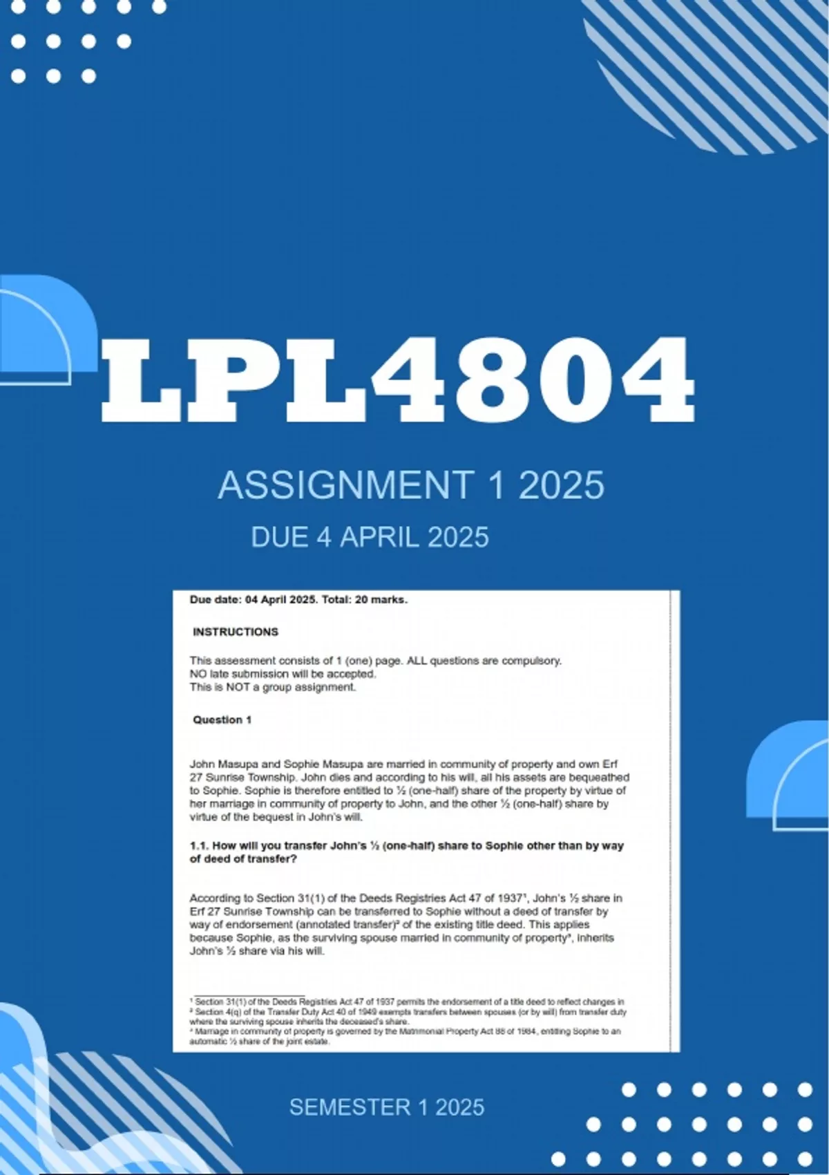 LPL4804 Due date: 04 April 2025. Total: 20 marks. INSTRUCTIONS This assessment consists of 1 (one) page. ALL questions are compulsory. NO late submission will be accepted. This is NOT a group assignment. Question 1 John Masupa and Sophie Masupa are married in community of property and own Erf 27 Sunrise Township. John dies and according to his will, all his assets are bequeathed to Sophie. Sophie is therefore entitled to ½ (one-half) share of the property by virtue of her marriage in community of property to John, and the other ½ (one-half) share by virtue of the bequest in John’s will. 1.1. How will you transfer John’s ½ (one-half) share to Sophie other than by way of deed of transfer? According to Section 31(1) of the Deeds Registries Act 47 of 1937¹, John’s ½ share in Erf 27 Sunrise Township can be transferred to Sophie without a deed of transfer by way of endorsement (annotated transfer)² of the existing title deed. This applies because Sophie, as the surviving spouse married in community of property³, inherits John’s ½ share via his will. ¹ Section 31(1) of the Deeds Registries Act 47 of 1937 permits the endorsement of a title deed to reflect changes in ² Section 4(q) of the Transfer Duty Act 40 of 1949 exempts transfers between spouses (or by will) from transfer duty