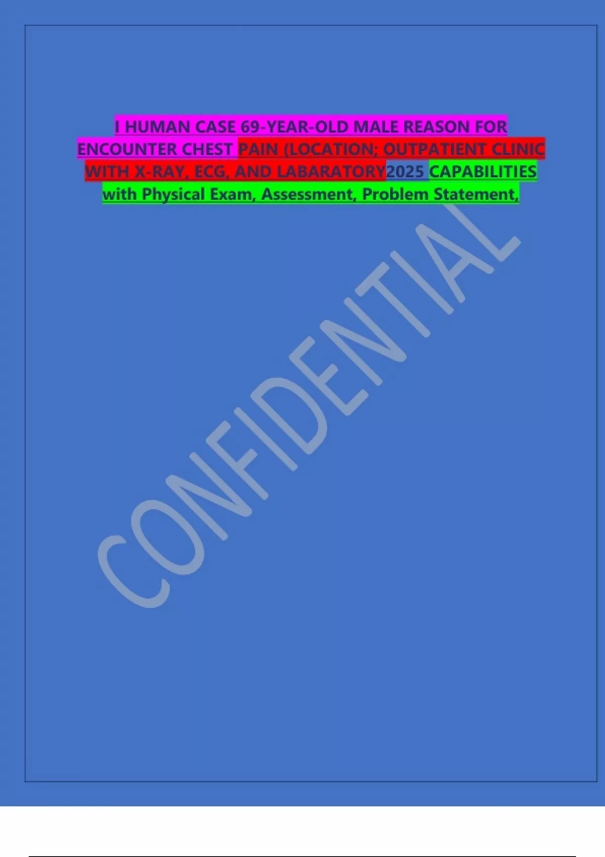 I HUMAN CASE 69-YEAR-OLD MALE REASON FOR ENCOUNTER CHEST PAIN (LOCATION; OUTPATIENT CLINIC WITH X-RAY, ECG, AND LABARATORY2025 CAPABILITIES with Physical Exam, Assessment, Problem Statement,