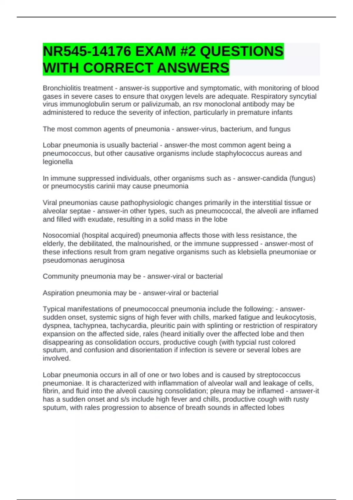 Lobar pneumonia is usually bacterial - answer-the most common agent being a