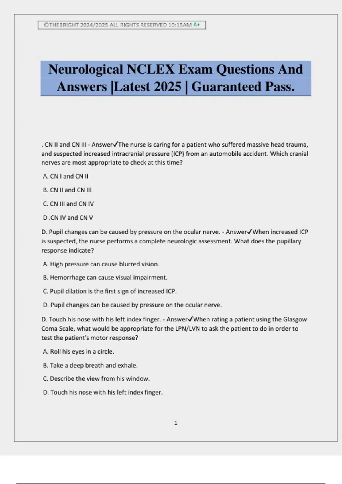. CN II and CN III - Answer✔The nurse is caring for a patient who suffered massive head trauma,
