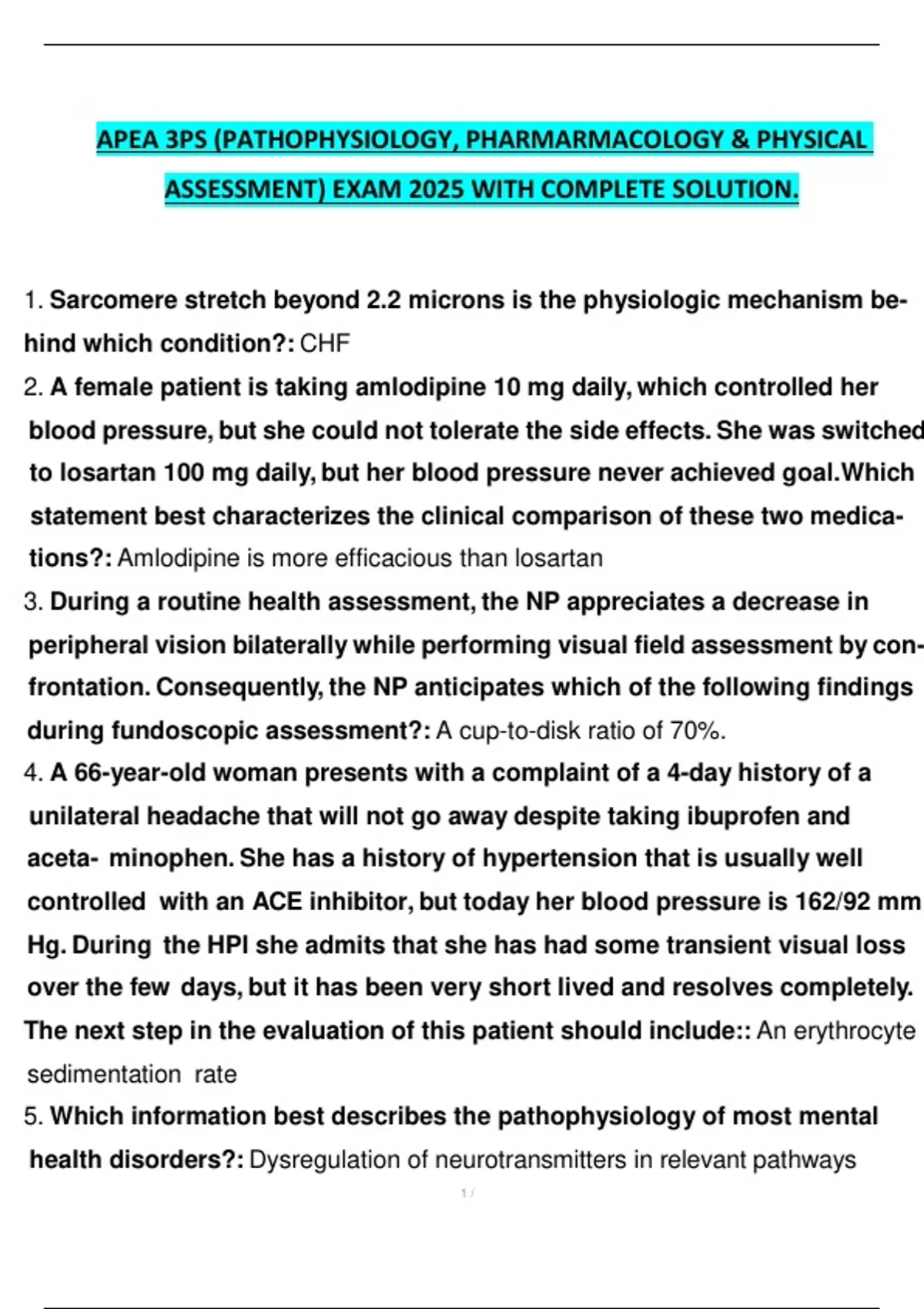 APEA 3PS (PATHOPHYSIOLOGY, PHARMARMACOLOGY & PHYSICAL ASSESSMENT) EXAM 2025 WITH COMPLETE SOLUTION.
