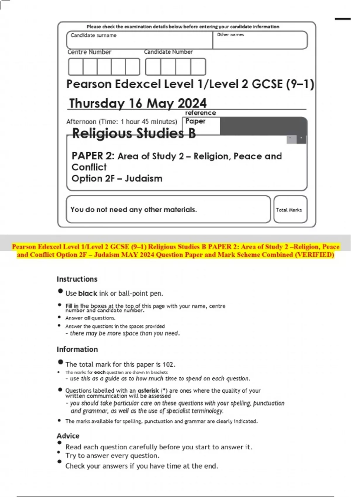 Pearson Edexcel Level 1/Level 2 GCSE (9–1) Religious Studies B PAPER 2: Area of Study 2 – Religion, Peace and Conflict Option 2F – Judaism MAY Question Paper and Mark Scheme MERGED