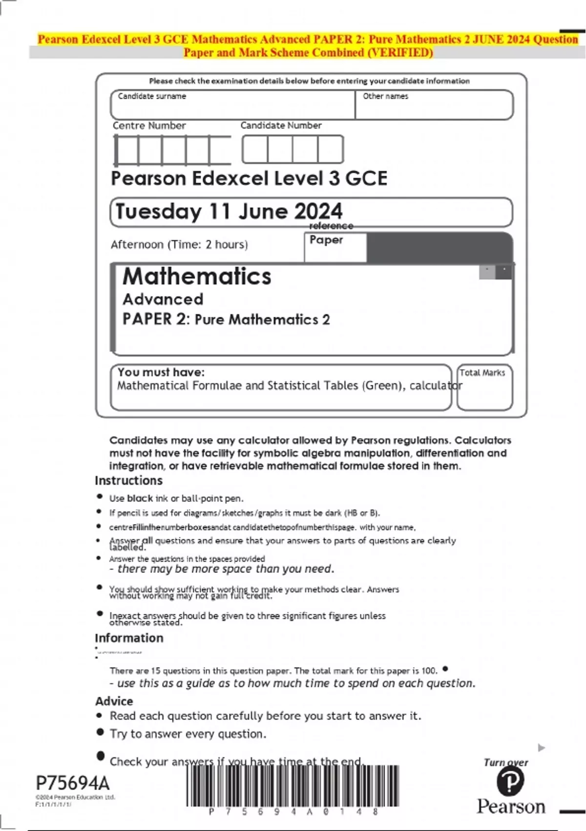 2024 Pearson Edexcel Level 3 GCE Mathematics Advanced PAPER 2: Pure Mathematics 2 JUNE Question Paper and Mark Scheme MERGED