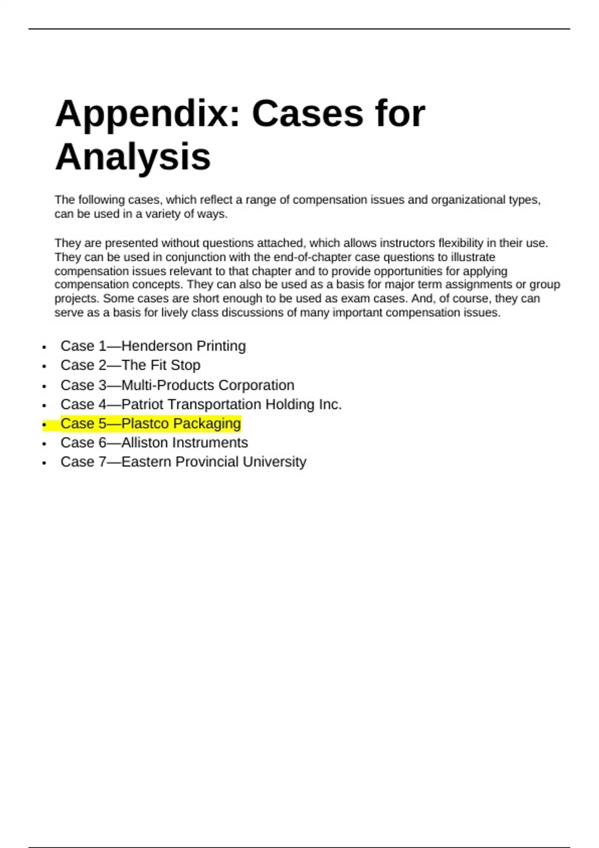 Appendix: Cases for Analysis The following cases, which reflect a range of compensation issues and organizational types, can be used in a variety of ways. They are presented without questions attached, which allows instructors flexibility in their use. They can be used in conjunction with the end-of-chapter case questions to illustrate compensation issues relevant to that chapter and to provide opportunities for applying compensation concepts. They can also be used as a basis for major term assignments or group projects. Some cases are short enough to be used as exam cases. And, of course, they can serve as a basis for lively class discussions of many important compensation issues.  Case 1—Henderson Printing  Case 2—The Fit Stop  Case 3—Multi-Products Corporation  Case 4—Patriot Transportation Holding Inc.  Case 5—Plastco Packaging  Case 6—Alliston Instruments  Case 7—Eastern Provincial University