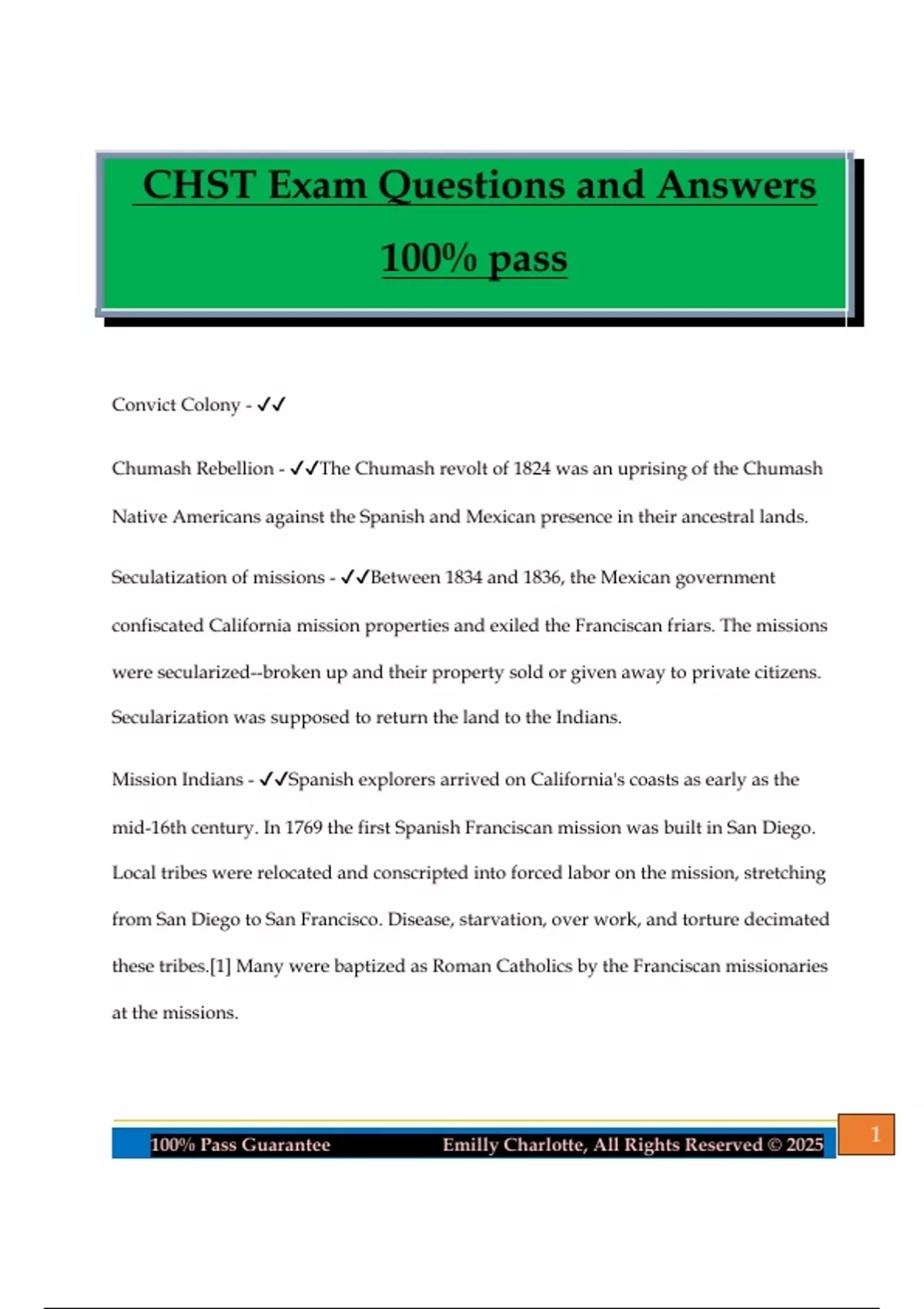 CHST Exam Questions and Answers 100% pass Convict Colony - Chumash Rebellion - The Chumash revolt of 1824 was an uprising of the Chumash Native Americans against the Spanish and Mexican presence in their ancestral lands. Seculatization of missions - Between 1834 and 1836, the Mexican government confiscated California mission properties and exiled the Franciscan friars. The missions were secularized--broken up and their property sold or given away to private citizens. Secularization was supposed to return the land to the Indians. Mission Indians - Spanish explorers arrived on California's coasts as early as the mid-16th century. In 1769 the first Spanish Franciscan mission was built in San Diego. Local tribes were relocated and conscripted into forced labor on the mission, stretching from San Diego to San Francisco. Disease, starvation, over work, and torture decimated these tribes.[1] Many were baptized as Roman Catholics by the Franciscan missionaries at the missions. 2100% Pass Guarantee Emilly Charlotte, All Rights Reserved © 2025 Californios - Californios as "persons of Spanish or Mexican heritage whose place of birth or residence was California, as distinct from residents who went to California from the U.S. or elsewhere John C Fremont - Frémont was convicted in court martial for mutiny and insubordination over a conflict of who was the military Governor of California. Bear Flaggers - During the Bear Flag Revolt, from June to July 1846, a small group of American settlers in California rebelled against the Mexican government and proclaimed California an independent republic. The republic was short-lived because soon after the Bear Flag was raised, the U.S. military began occupying California, which went on to join the union in 1850. The Bear Flag became the official state flag in 1911. Gold Rush - The Gold Rush had severe effects on Native Californians and resulted in a precipitous population decline from disease, genocide and starvation. By the time it ended, California had gone from a thinly populated ex-Mexican territory to the home state of the first nominee for the Republican Party. Cholos - a Latin American with Indian blood; a mestiz