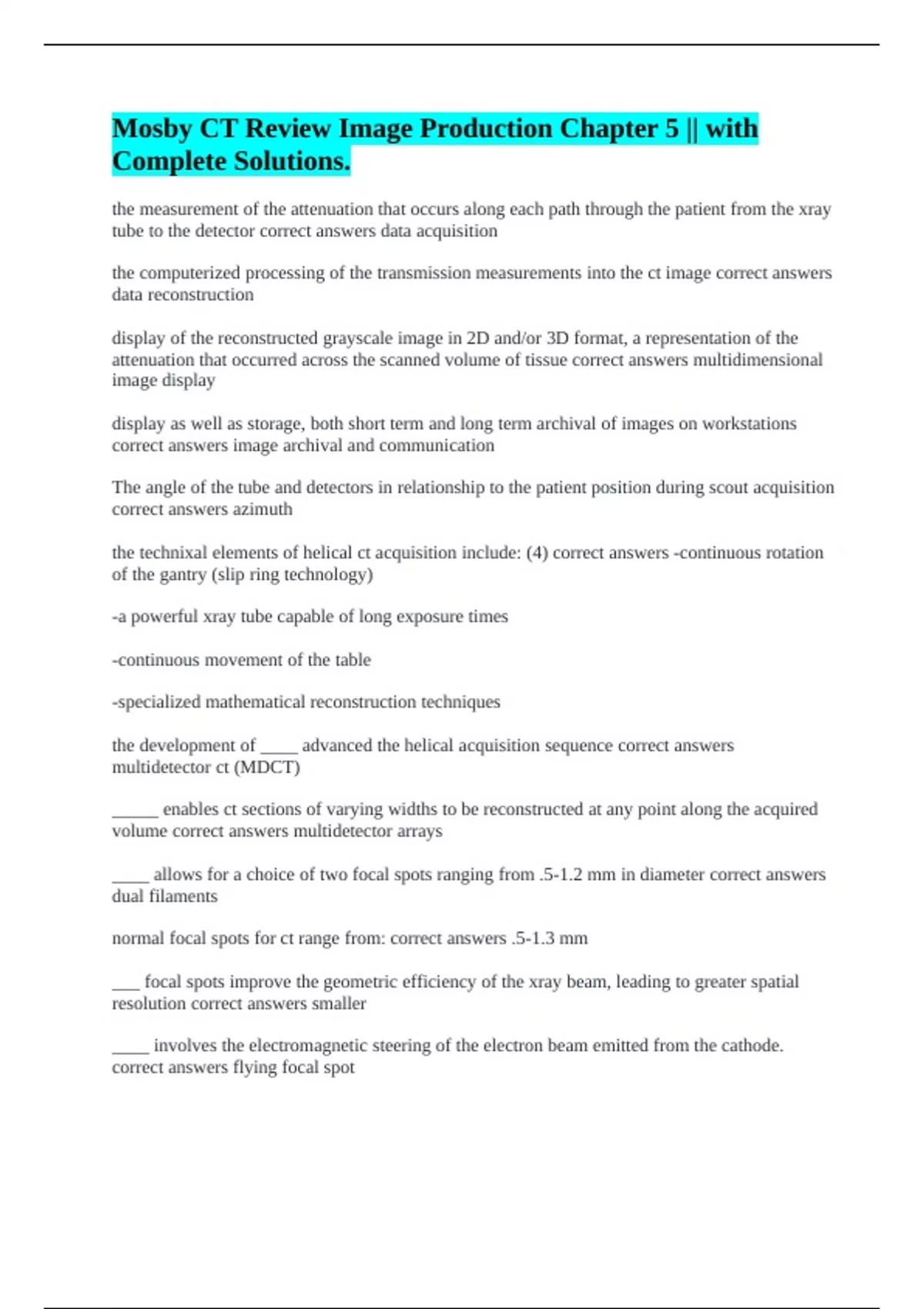 the measurement of the attenuation that occurs along each path through the patient from the xray tube to the detector correct answers data acquisition the computerized processing of the transmission measurements into the ct image correct answers data reconstruction display of the reconstructed grayscale image in 2D and/or 3D format, a representation of the attenuation that occurred across the scanned volume of tissue correct answers multidimensional image display display as well as storage, both short term and long term archival of images on workstations correct answers image archival and communication The angle of the tube and detectors in relationship to the patient position during scout acquisition correct answers azimuth the technixal elements of helical ct acquisition include: (4) correct answers -continuous rotation of the gantry (slip ring technology) -a powerful xray tube capable of long exposure times -continuous movement of the table -specialized mathematical reconstruction techniques the development of ____ advanced the helical acquisition sequence correct answers multidetector ct (MDCT) _____ enables ct sections of varying widths to be reconstructed at any point along the acquired volume correct answers multidetector arrays ____ allows for a choice of two focal spots ranging from .5-1.2 mm in diameter correct answers dual filaments normal focal spots for ct range from: correct answers .5-1.3 mm ___ focal spots improve the geometric efficiency of the xray beam, leading to greater spatial resolution correct answers smaller ____ involves the electromagnetic steering of the electron beam emitted from the cathode. correct answers flying focal spot