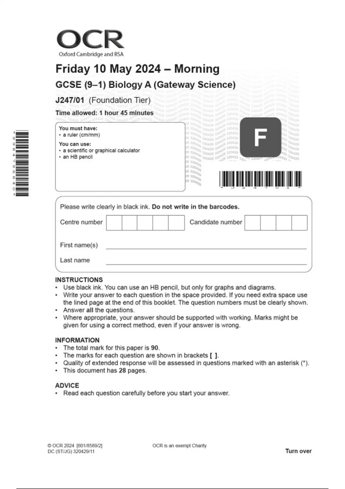 OCR GCSE Biology A (Gateway Science) J247/01 (Foundation Tier) JUNE 2024 QUESTION PAPER
