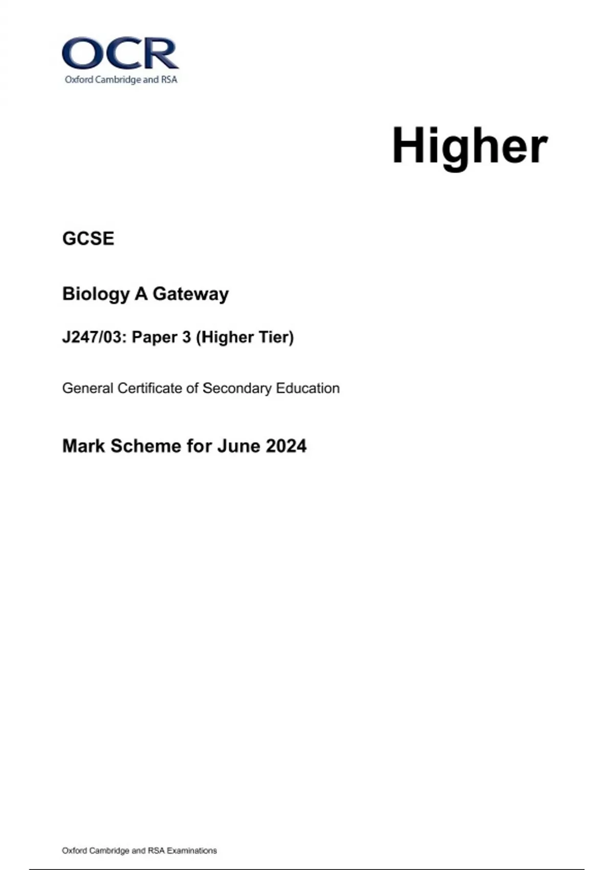 OCR GCSE Biology A (Gateway Science) J247/03 (Higher Tier) JUNE 2024 QUESTION PAPER AND MARK SCHEME