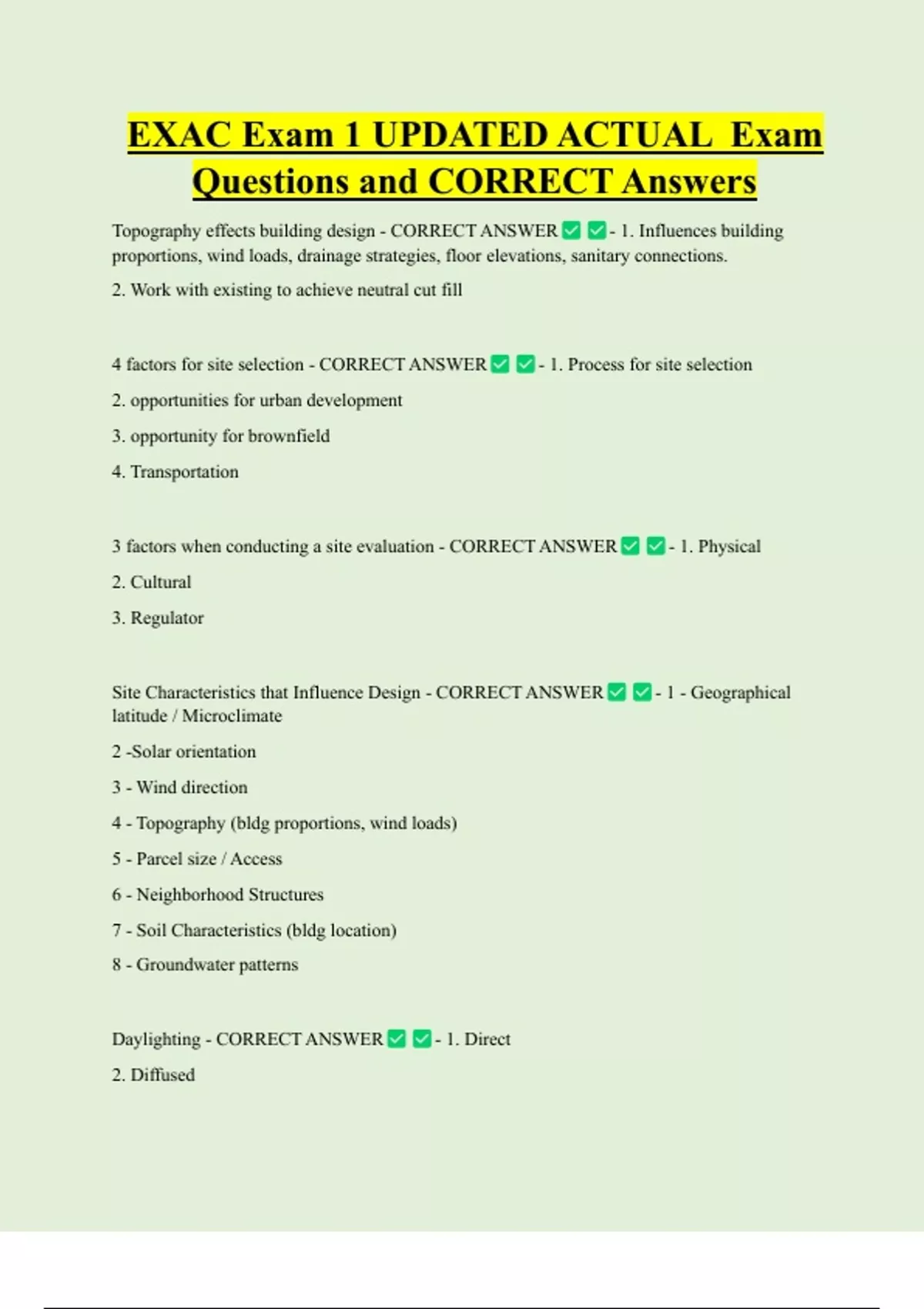 EXAC Exam 1 UPDATED ACTUAL Exam Questions and CORRECT Answers Topography effects building design - CORRECT ANSWER - 1. Influences building proportions, wind loads, drainage strategies, floor elevations, sanitary connections. 2. Work with existing to achieve neutral cut fill 4 factors for site selection - CORRECT ANSWER 2. opportunities for urban development 3. opportunity for brownfield 4. Transportat