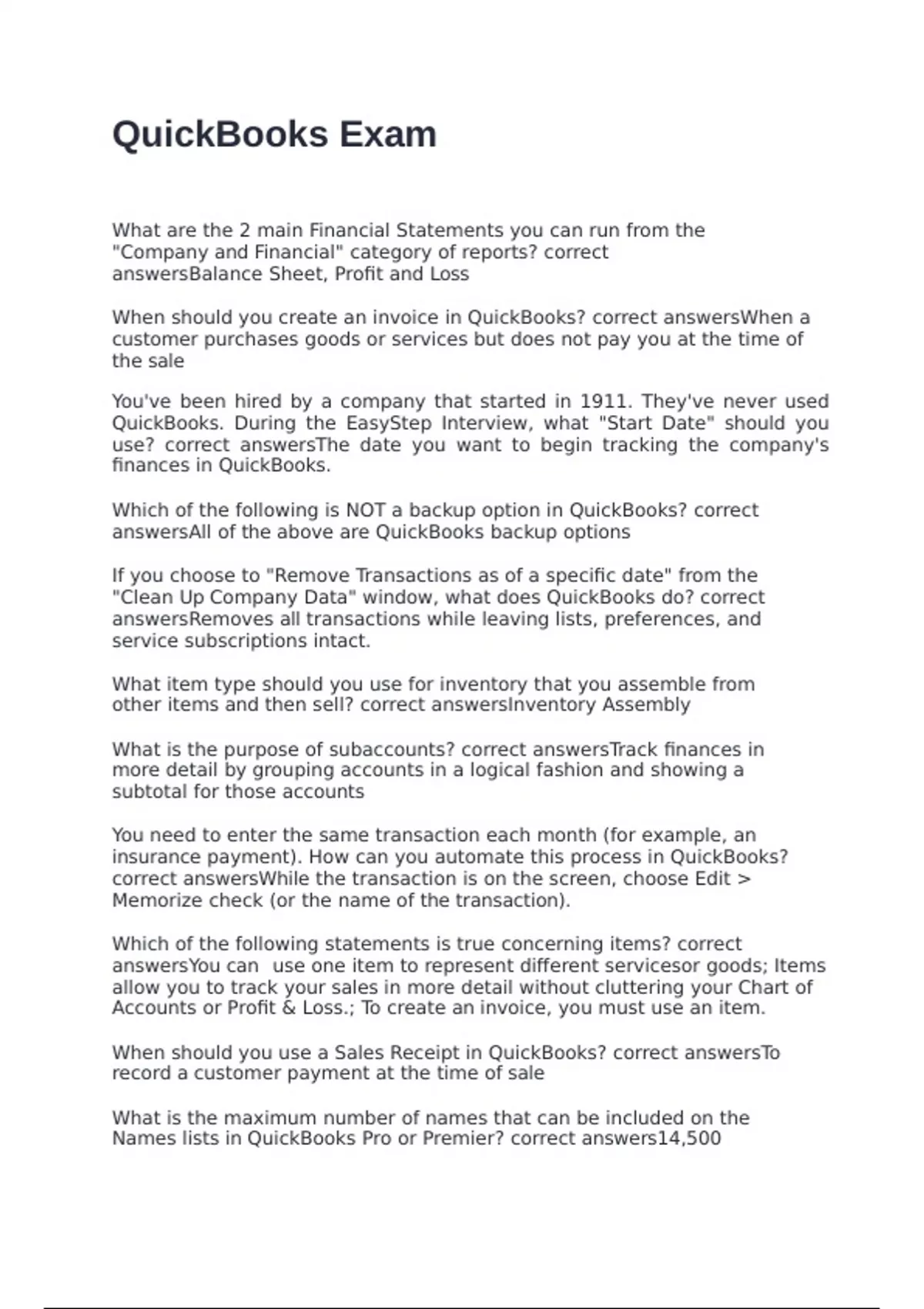 What is one way that QuickBooks uses the Account Type? a. To track revenue and expense by office or business segment b. For financial ratios in the Analysis module c. To change the color of different sections on the financial statements d. To identify where the account appears on the financial statements correct answersd. To identify where the account appears on the financial statements This is the correct answer. The first set of accounts appear on the Balance Sheet (Assets, Liabilities and Equity). Then the next types of accounts appear on the Profit & Loss Statement (Income, Cost of Goods Sold, and Expenses). What does the term "Double-entry accounting" mean? a. That the Income and Expense accounts are always part of every transaction. b. There are always at least two accounts involved in every financial transaction. c. That the Cost of Goods Sold account and the Liabilities account are always part of a transaction. d. The Equity and Asset accounts are always involved in a transaction. correct answersb. There are always at least two accounts involved in every financial transaction. This is the correct answer. Debits must equal credits, so for every transaction, there is a source and a use. What is the purpose of the Chart of Accounts? a. It allows accountants to view accounting records remotely. b. It is how you categorize financial transactions. c. To see a graphical chart of income and expenses. d. To categorize items. correct answersb. It is how you categorize financial transactions. This is the correct answer. The Chart of Accounts is a way to label or categorize all the money/value that comes into a business, all the money/value that goes out, and all the money that is transferred between different categories. You suspect that someone has changed a transaction. What report should you run? a. Audit Trail Report b. User Entry Report