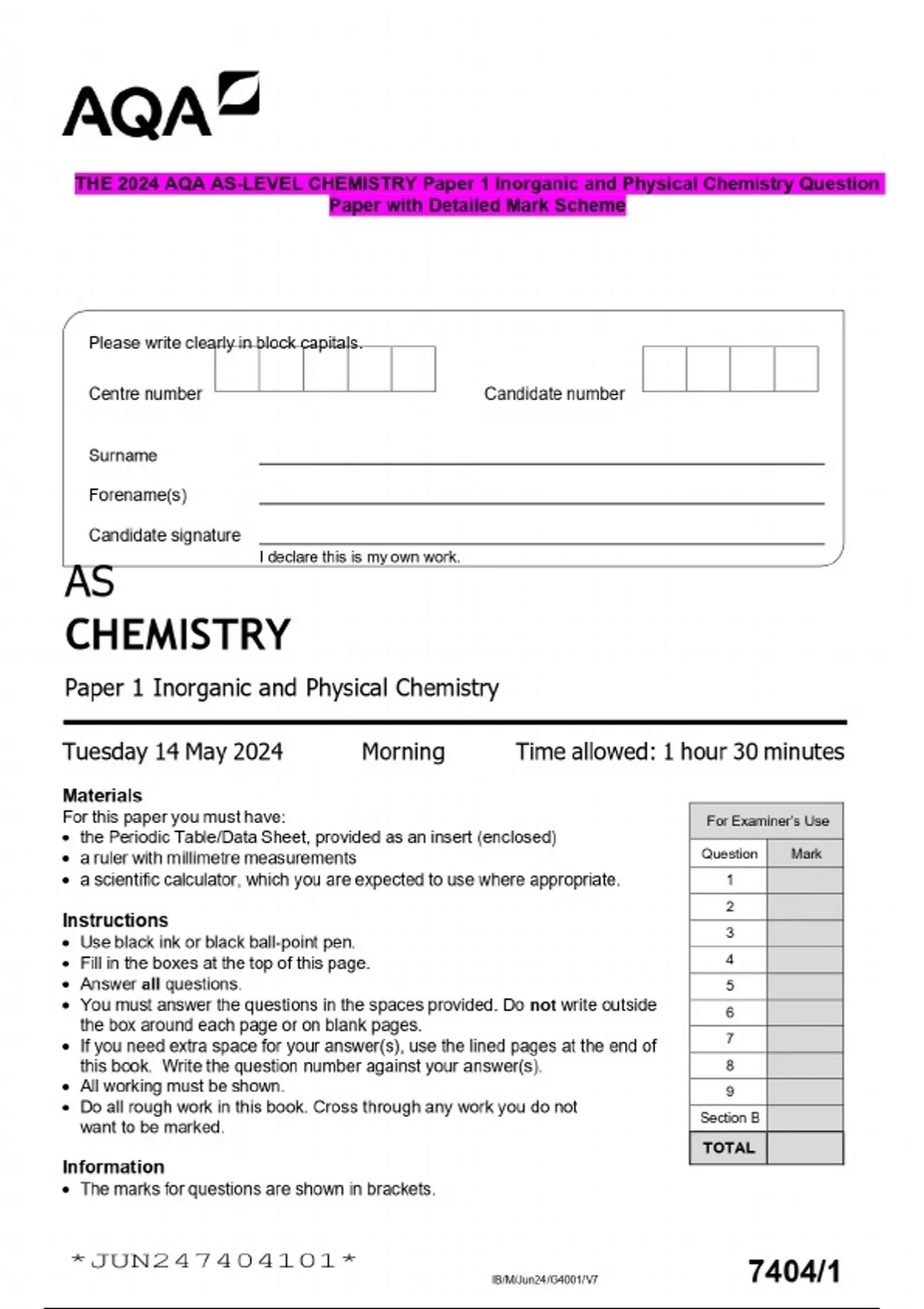 THE 2024 AQA AS-LEVEL CHEMISTRY Paper 1 Inorganic and Physical Chemistry Question Paper with Detailed Mark Scheme