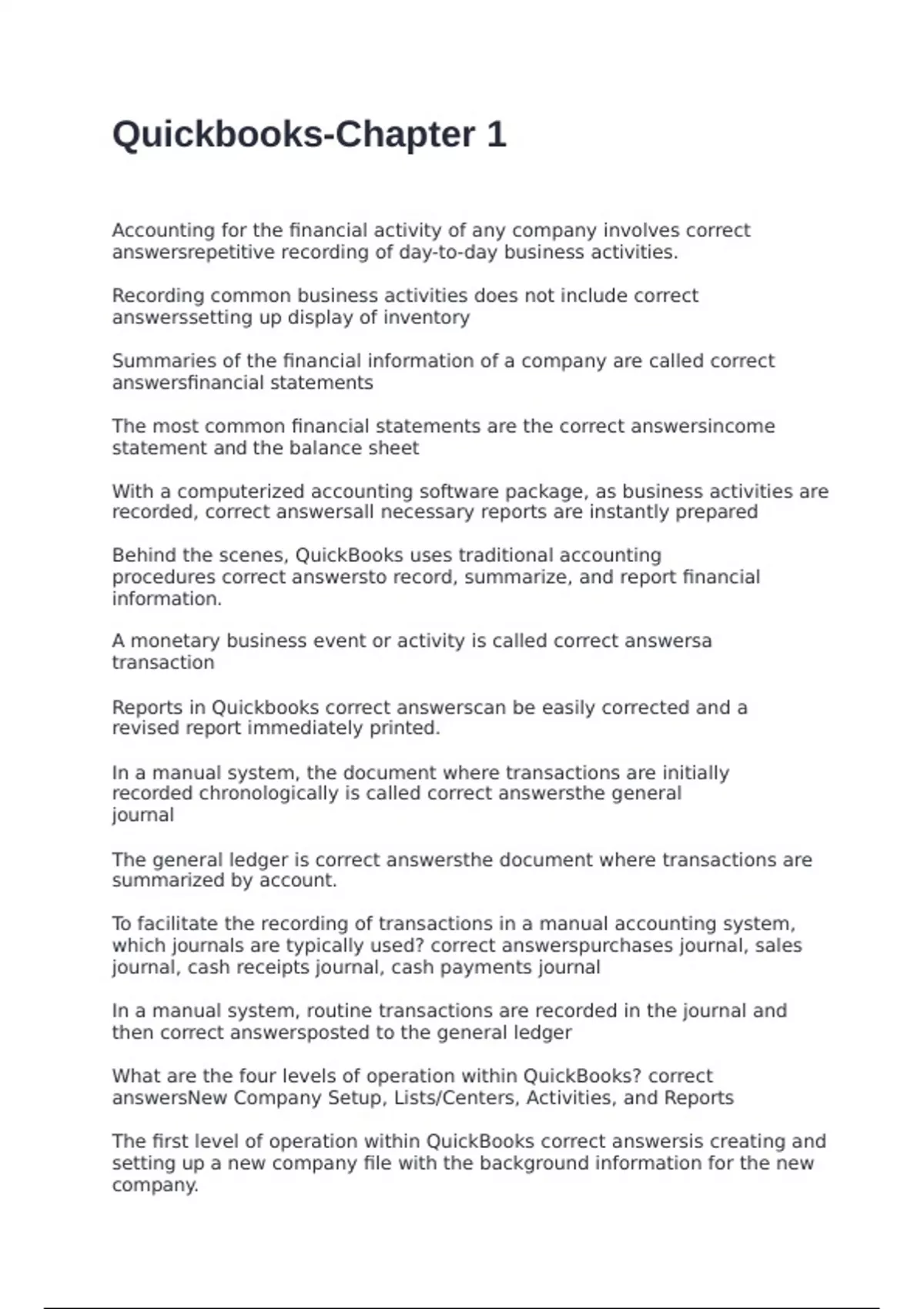 Accounting for the financial activity of any company involves correct answersrepetitive recording of day-to-day business activities. Recording common business activities does not include correct answerssetting up display of inventory Summaries of the financial information of a company are called correct answersfinancial statements The most common financial statements are the correct answersincome statement and the balance sheet With a computerized accounting software package, as business activities are recorded, correct answersall necessary reports are instantly prepared Behind the scenes, QuickBooks uses traditional accounting procedures correct answersto record, summarize, and report financial information. A monetary business event or activity is called correct answersa transaction Reports in Quickbooks correct answerscan be easily corrected and a revised report immediately printed. In a manual system, the document where transactions are initially recorded chronologically is called correct answersthe general journal The general ledger is correct answersthe
