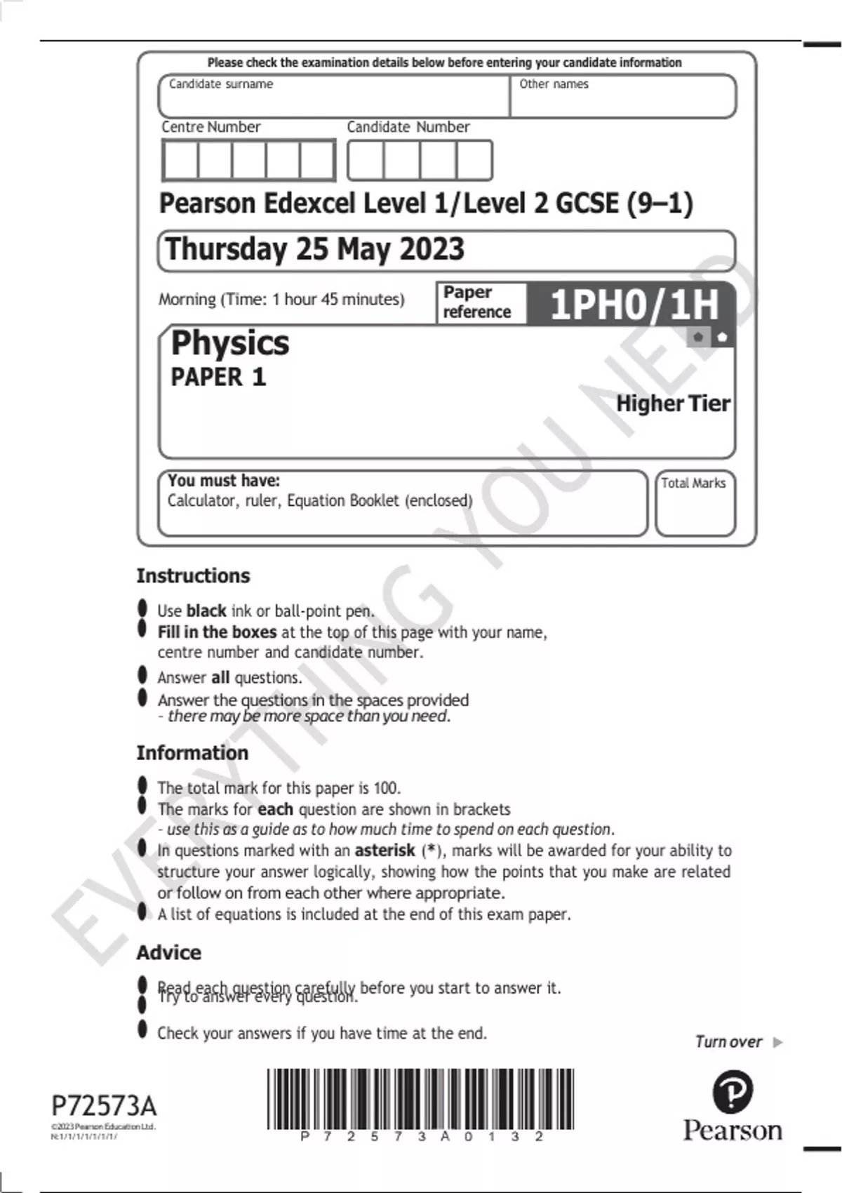 Calculator, ruler, Equation Booklet (enclosed)