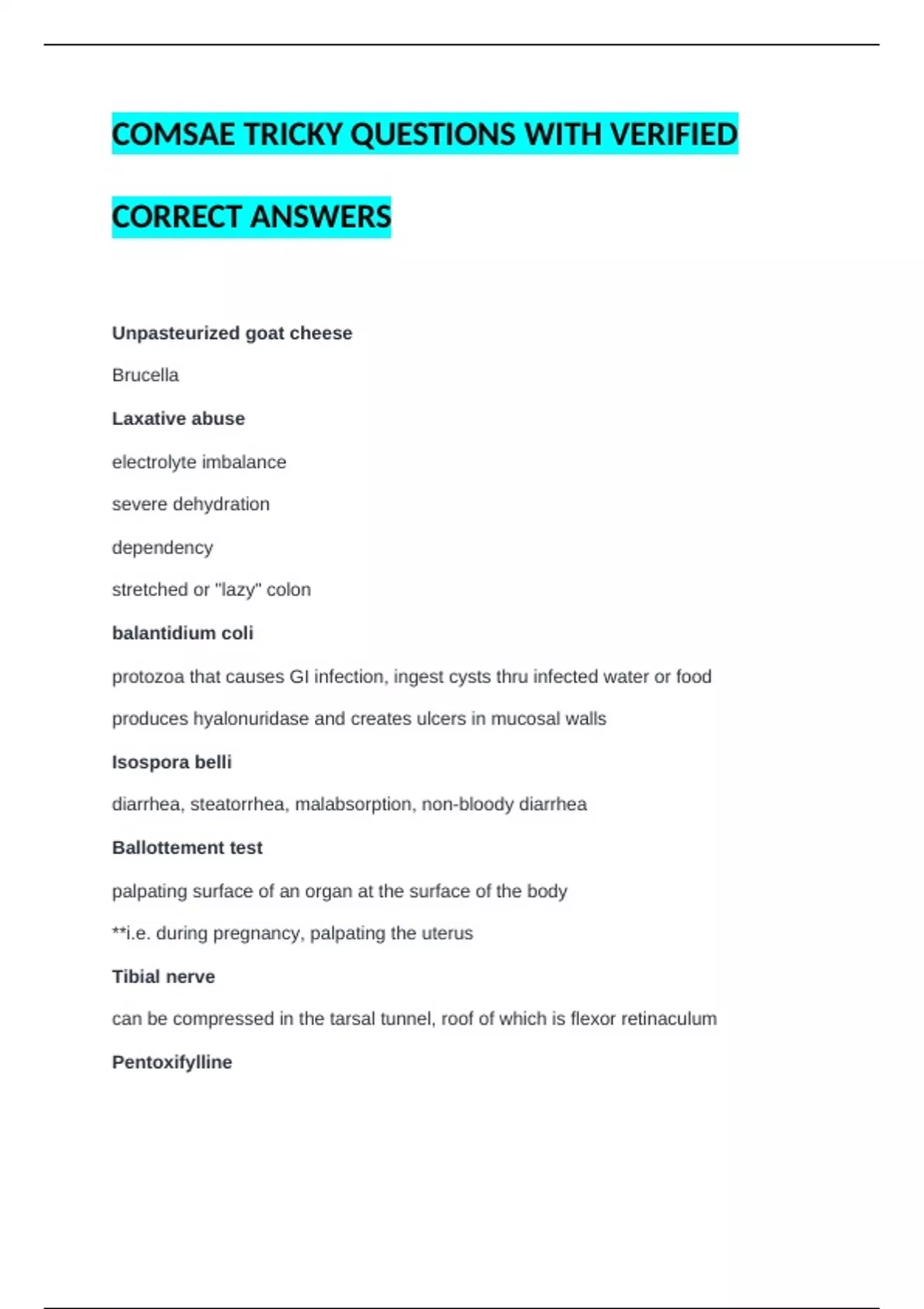 This document compiles a focused set of tricky, high-yield COMSAE questions with verified correct answers covering infectious diseases, parasitology, GI pathogens, and musculoskeletal/physical exam maneuvers. It includes concise explanations for organisms associated with contaminated food or water, complications of medication misuse, and clinical testing methods used in patient assessment. Designed to strengthen recall of commonly missed concepts and improve accuracy on COMSAE and COMLEX exam items. Ideal for rapid review or last-minute exam reinforcement.