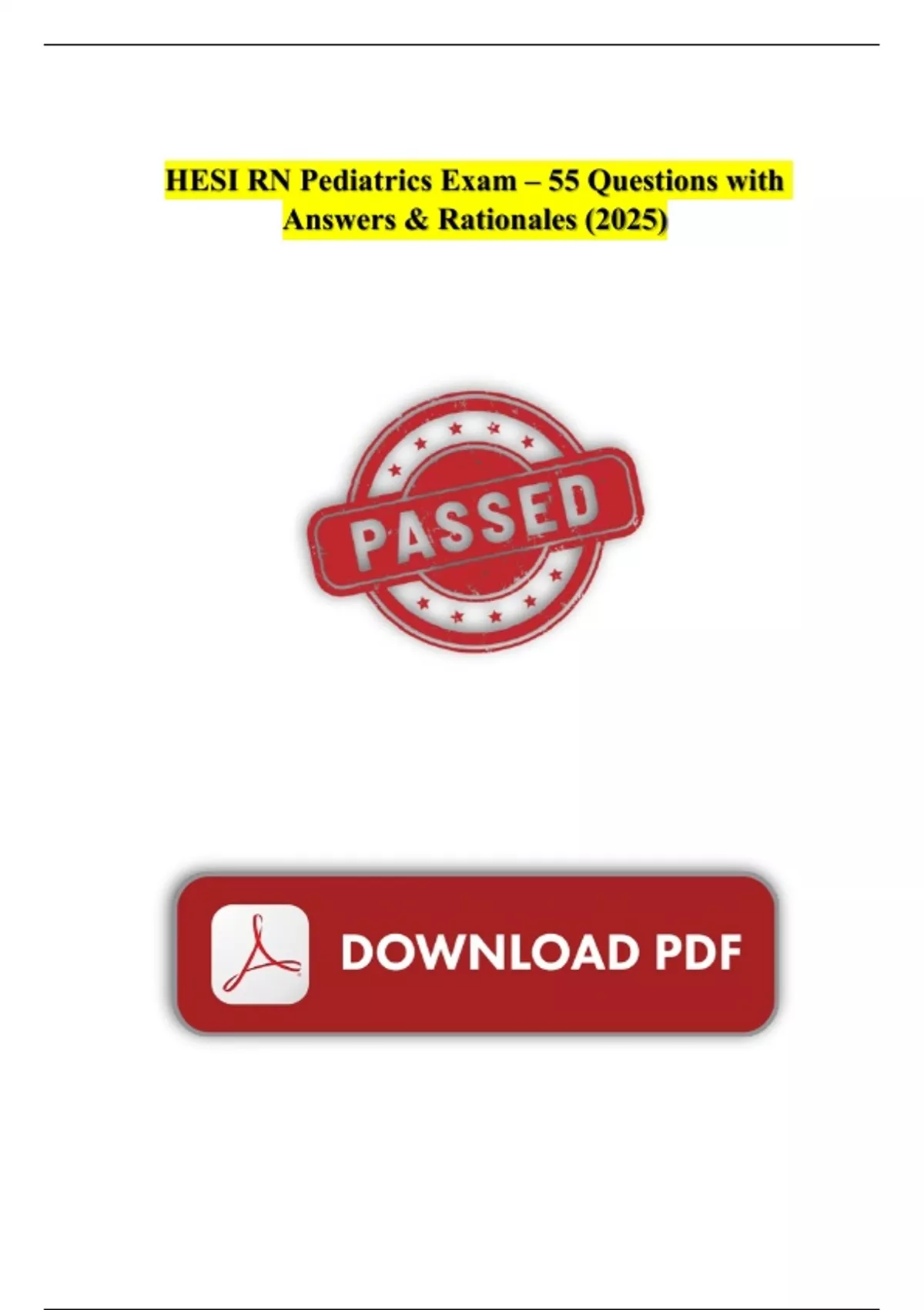 This document contains 55 carefully selected questions from the 2025 HESI RN Pediatrics Exam, complete with correct answers and in-depth rationales. It covers essential pediatric nursing topics such as growth and development, pediatric disorders, medication administration, and family-centered care. Ideal for RN students preparing for the HESI Pediatrics assessment with a focus on understanding and application.