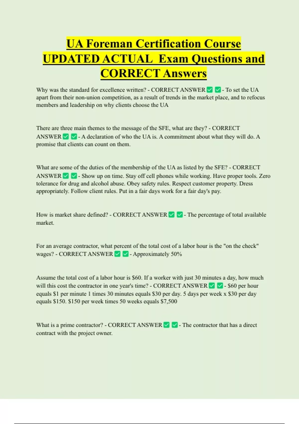 UA Foreman Certification Course UPDATED ACTUAL Exam Questions and CORRECT Answers Why was the standard for excellence written? - CORRECT ANSWER - To set the UA apart from their non-union competition, as a result of trends in the market place, and to refocus members and leadership on why clients choose the UA There are three main themes to the message of the SFE, what are they? - CORRECT ANSWER - A declaration of who the UA is. A commitment about what they will do. A promise that clients can count on them