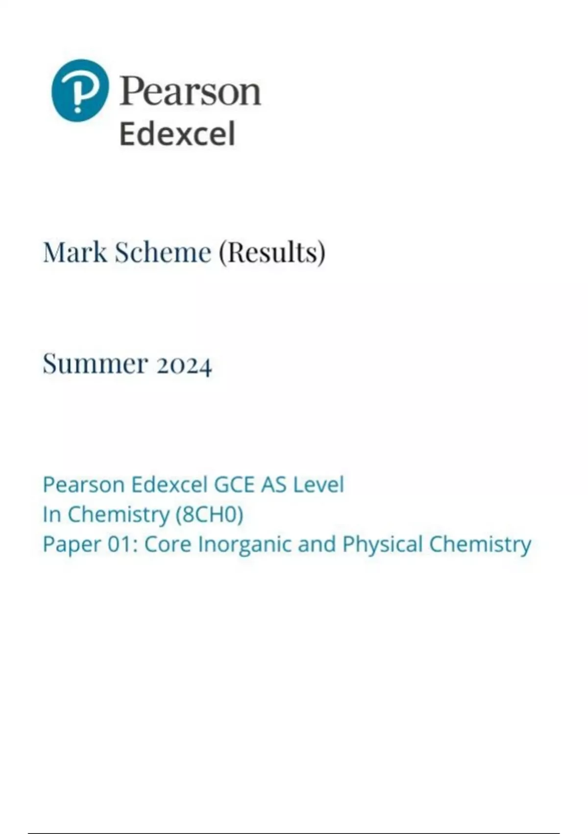 PEARSON EDEXCEL AS LEVEL CHEMISTRY PAPER 1 JUNE 2024 FINAL MARK SCHEME