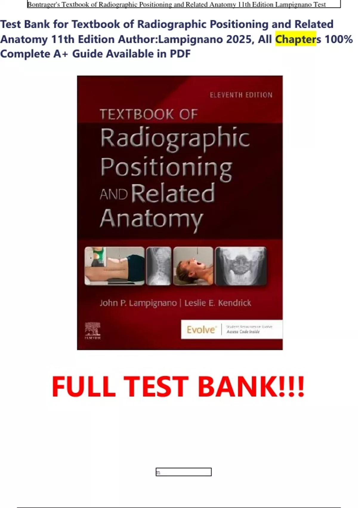 Test Bank for Textbook of Radiographic Positioning and Related Anatomy 11th Edition Author:Lampignano 2025, All Chapters 100% Complete A+ Guide Available in PDF
