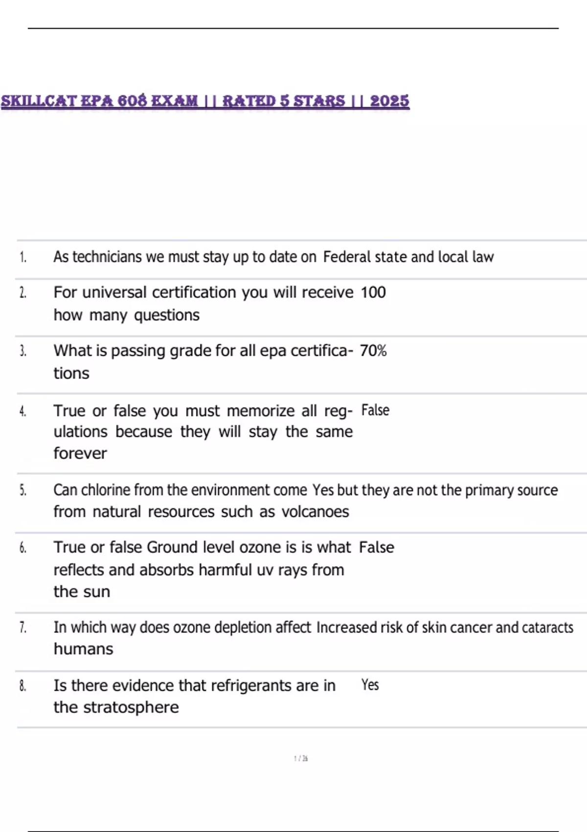 SKILLCAT EPA 608 EXAM || RATED 5 STARS || 2025 1. As technicians we must stay up to date on Federal state and local law 2. For universal certification you will receive 100 how many questions 3. What is passing grade for all epa certifica- 70% tions 4. True or false you must memorize all reg- ulations because they will stay the same forever