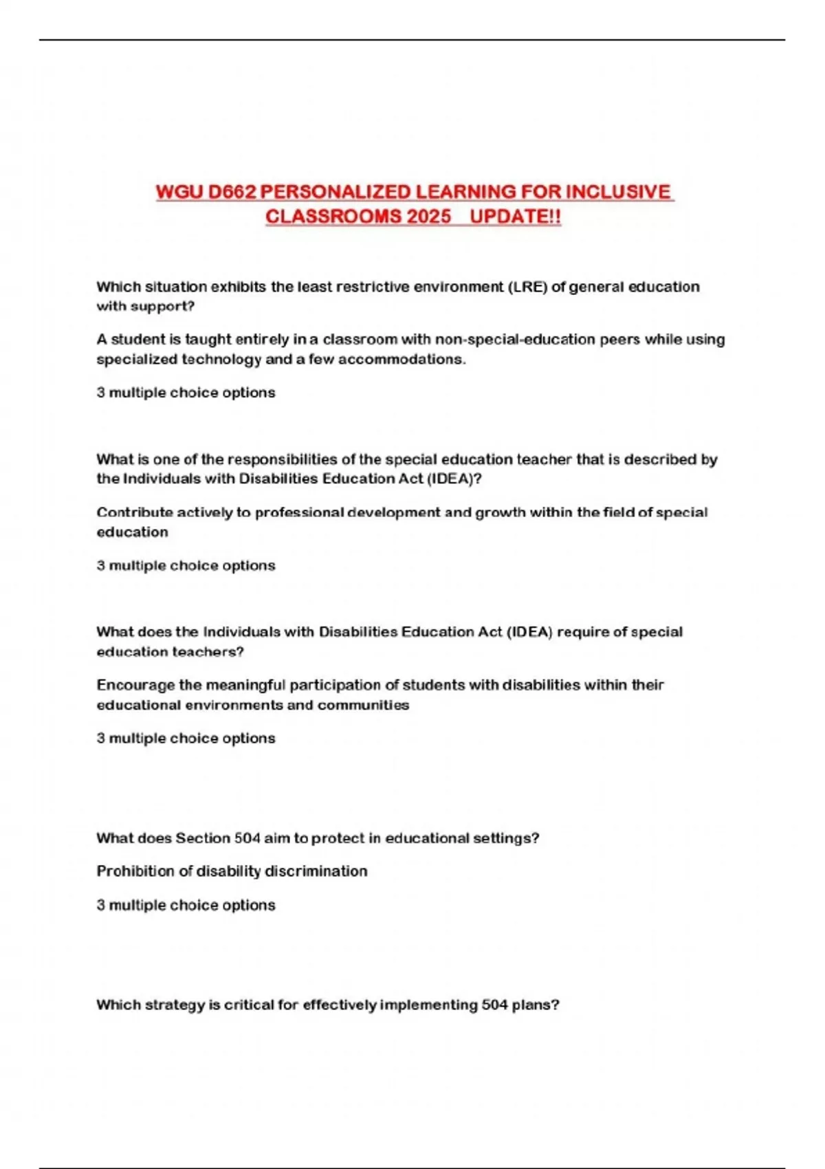 WGU D662 PERSONALIZED LEARNING FOR INCLUSIVE CLASSROOMS 2025 UPDATE!!...