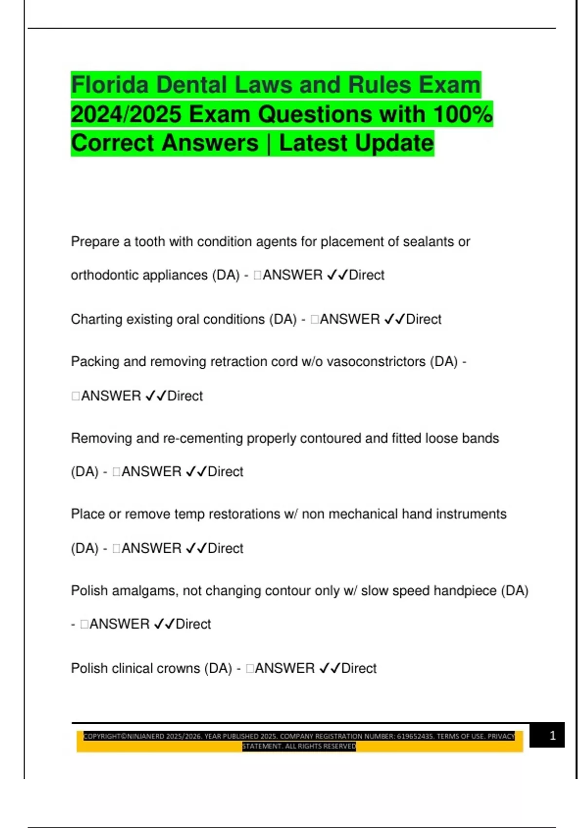 Florida Dental Laws and Rules Exam 2024/2025 Exam Questions with 100% Correct Answers | Latest Update