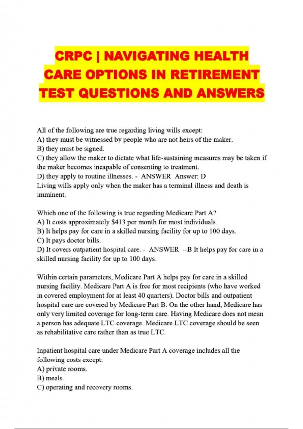 CRPC | NAVIGATING HEALTH CARE OPTIONS IN RETIREMENT TEST QUESTIONS AND ANSWERS....