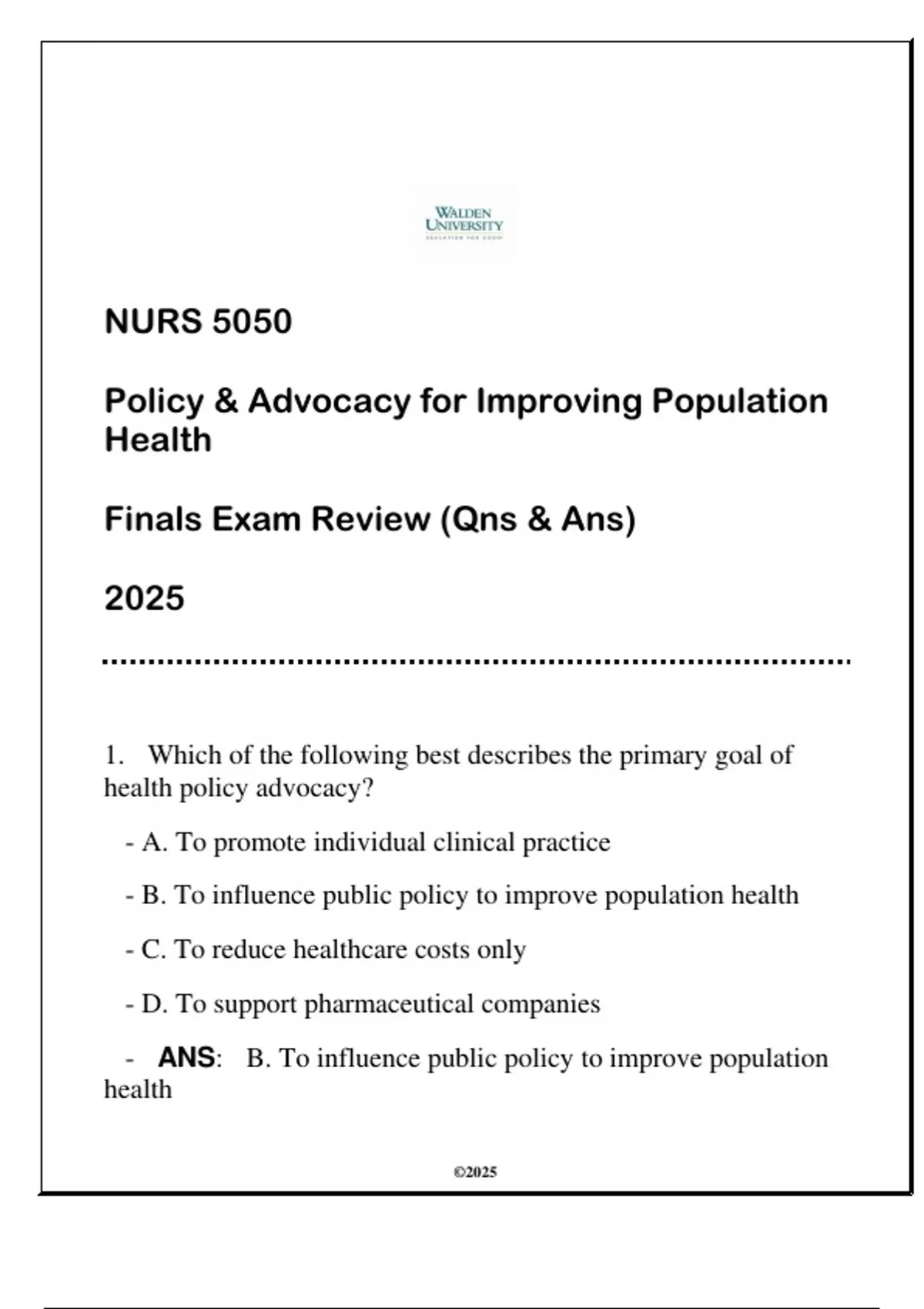 - ANS: B. To influence public policy to improve population