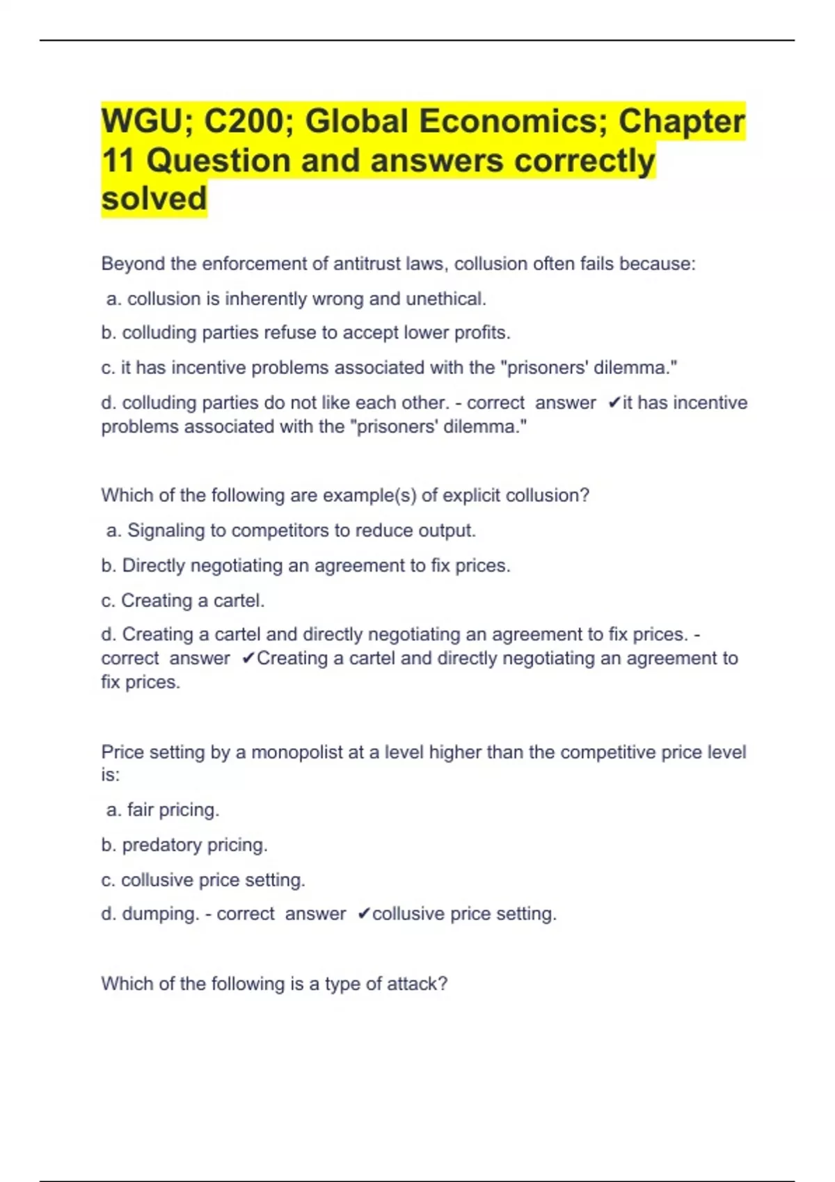 WGU; C200; Global Economics; Chapter 11 Question and answers correctly solved Beyond the enforcement of antitrust laws, collusion often fails because: a. collusion is inherently wrong and unethical. b. colluding parties refuse to accept lower profits. c. it has incentive problems associated with the "prisoners' dilemma." d. colluding parties do not like each other. - correct answer it has incentive problems associated with the "prisoners' dilemma." Which of the following are example(s) of explicit collusion? a. Signaling to competitors to reduce output. b. Directly negotiating an agreement to fix prices. c. Creating a cartel. d. Creating a cartel and directly negotiating an agreement to fix prices. - correct answer Creating a cartel and directly negotiating an agreement to fix prices. Price setting by