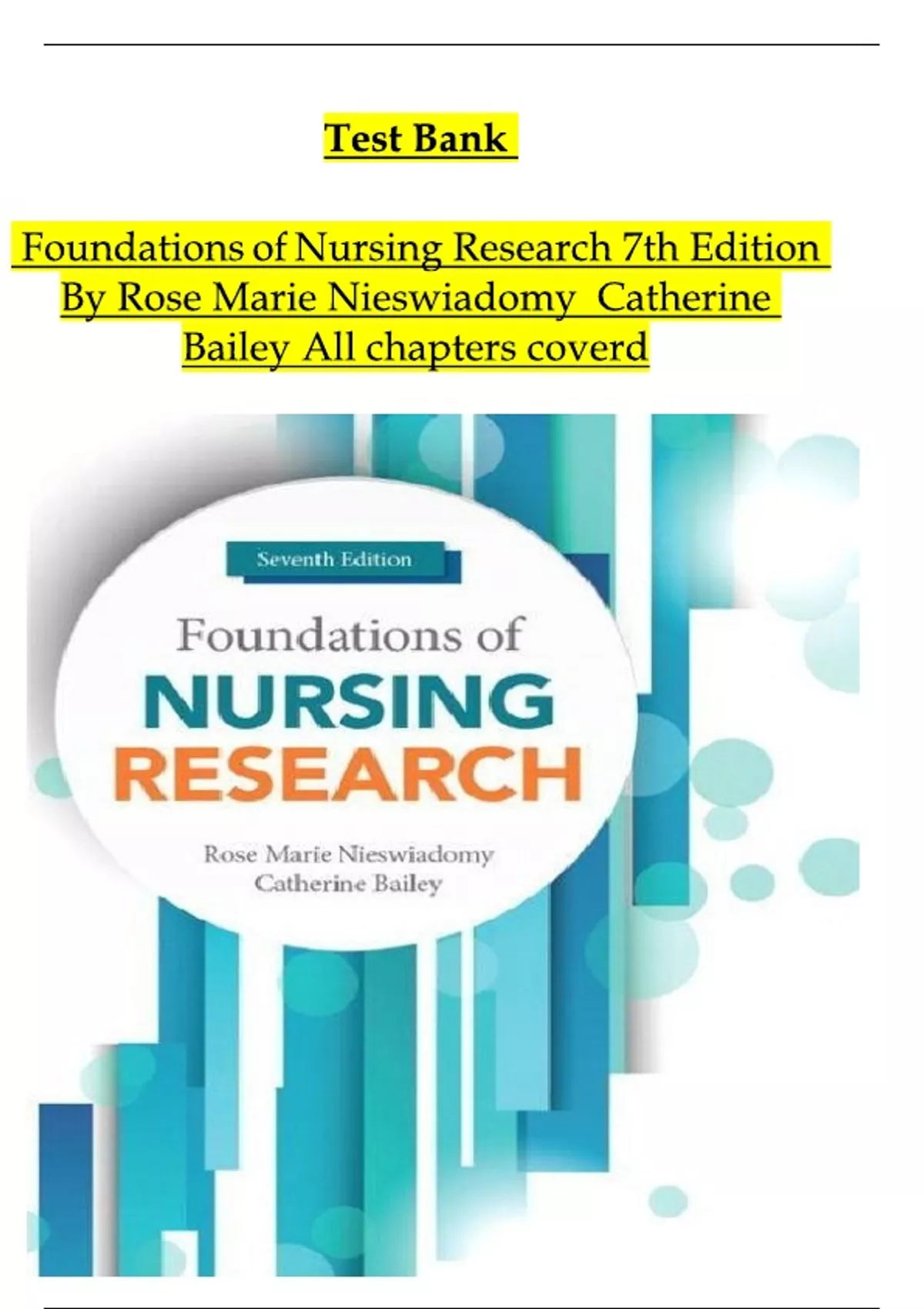 Test Bank for Foundations of Nursing Research 7th Edition By Rose Marie Nieswiadomy; Catherine Bailey Chapter 1-20 Complete Guide. 1 Development of Nursing Research 2 Evidence-Based Nursing Practice 3 Research Evidence in Nursing Practice 4 Ethical Issues in Nursing Research 5 An Overview of Quantitative and Qualitative Research 6 Identifying Nursing Research Problems 7 Review of the Literature 8 Theory and Nursing Research 9 Hypotheses 10 Quantitative Research Designs 11 Qualitative and Mixed Methods Research Designs 12 Populations and Samples 13 Measurement and Data Collection 14 Data-Collection Methods 15 Descriptive Statistics 16 Inferential Statistics 17 Presentation and Discussion of Study Findings 18 Communication and Utilization of Nursing Research 19 Nursing Research and Healthcare Economics 20 Critique of Research Reports