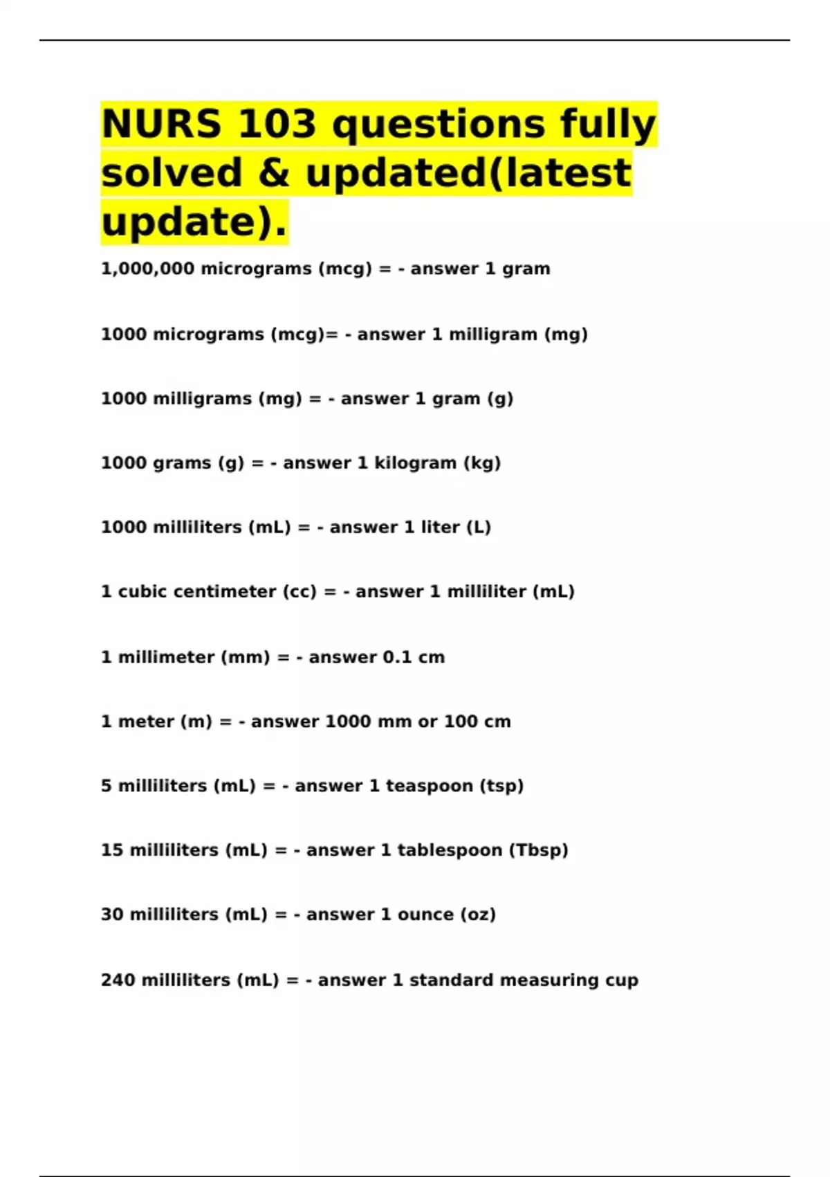 NURS 103 questions fully solved & updated(latest update).