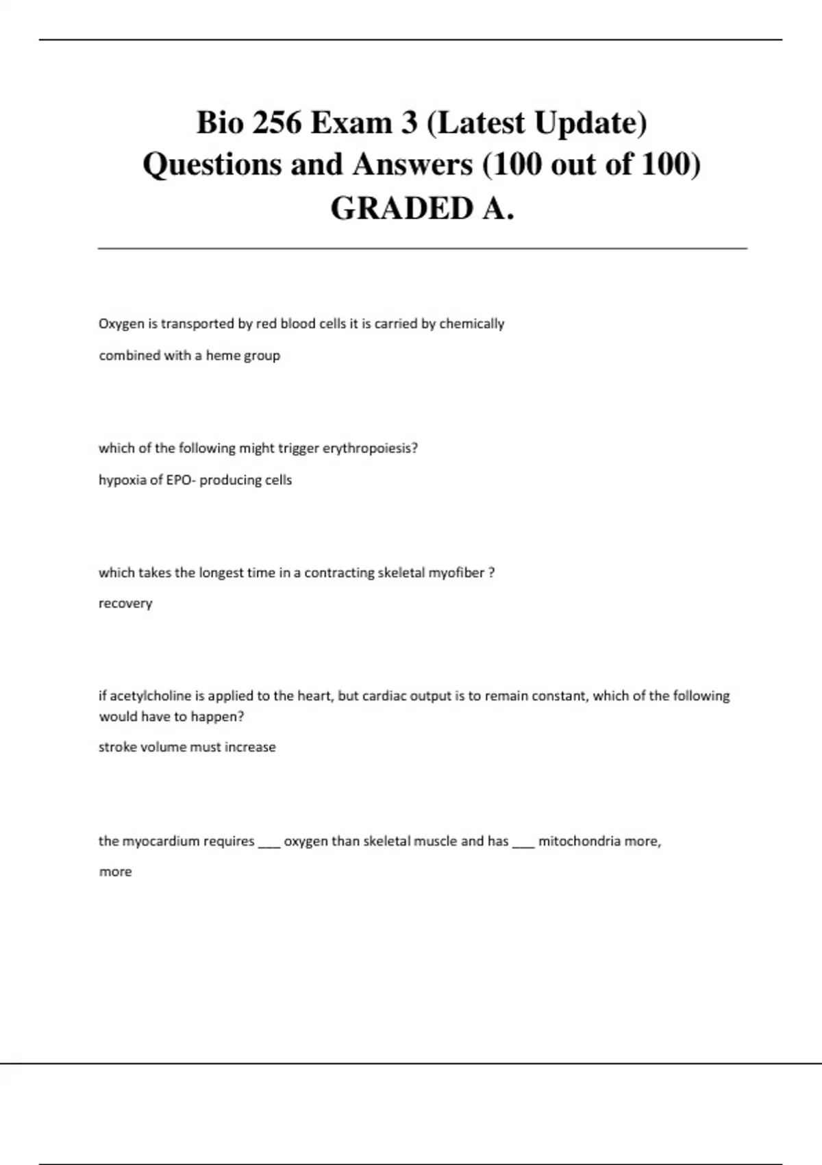 BIO 256 Exam 3 (Latest Update) Questions and Answered Elaborations (GRADED A) Chamberlain. Which of the following are composed of actin thin filaments the major function of the sarcoplasmic reticulum in muscle contraction is to regulate intracellular calcium concentration the sheet of connective tissue beneath skin around a muscle, providing a pathway for nerves and blood vessels is called the fascia a motor unit is a motor neuron and my-fibers it stimulates After nervous stimulation of the muscle cell has ceased, the acetylcholine is destroyed by acetylcholine esterase in muscle contraction calcium acts to change the shape of the troponin-tropomyosin complex muscle tone is a state of sustained partial contraction of muscles An elaborate network of membranes in skeletal muscle cells that functions in calcium storage is the sarcoplasmic reticulum the sheet of connective tissue beneath skin around a muscle, providing a pathway for nerves and blood vessels is called the fascia the major function of the sarcoplasmic reticulum in muscle contraction is to regulate intracellular calcium concentration a motor neuron and the myofibers it innervates is known as a(n) motor unit after nervous stimulation of the muscle cell has ceased, the acetylcholine is destroyed by acetyl choline esterase in muscle action potential, the wave of positive mV charge travels through the _______ to the sarcoplasm front he sarcolemma T-tubules A motor neuron and the myofibers it innervates is known as a(n) motor unit which take the longest time in a contracting skeletal myofiber recovery glucose delivered to a recovering myofiber is used reestablish glycogen stores smooth muscle is significantly different from striated muscle in several ways. which of the following is true smooth muscle can shorten and stretch more than striated muscle which of the following is a regulatory function of blood maintenance of normal pH in body tissues You obtain a tube of blood from a patient. EDTA anticoagulant is in the tube, so the blood does not clot. The tube is centrifuged and you remove the liquid from atop the cells. The liquid thus obtained is called plasma oxygen is transported by red blood cells, it is carried by attaching to the iron ion in heme the process of forming new blood cells is called erythropoiesis Term the primary organs whose macrophages are responsible for phagocytizing worn-out red blood cells are the speed and liver which would be associated with prematurely ruptured erythrocytes hemolytic anemia which of the following is a precursor of a neutrophil myeloblast which of the following is characteristic of all luekocytes they are nucleated acute leukemia is more common in _____ persons; chronic leukemia is more common in ______ persons younger, older when neither anti-A not anti-B agglutinates with a patients blood, their blood type is O We have an expert-written solution to this problem! the cardiac muscle contraction occurs when Ca++ enters the myofibers through slow channels The myocardium requires _____ oxygen than skeletal muscle and has _____ mitochondria more, more Initiation of a normal heart beat is the responsibility of the sinoatrial node Damage to the ________ is referred to as heart block. atrioventricular node Input from the sympathetic nervous system causes the heart rate to increase which component of an electrocardiogram indicates electrical activity associated with ventricular depolarization QRS complex the first heart sound (Lub of Lub-dub) is caused by the closure of the mitral and tricuspid valves During the period of ventricular filling, blood flows from the atria and through the open atrioventricular valves. how does exercising assure greater blood delivery to the active muscles exercising provides increased venous return to the heart Select the correct statement about cardiac output A slow heart rate increases end diastolic volume, stroke volume, and force of contraction. negative chronotropic factors are factors that decrease heart rate The effect of endurance-type athletic training may be to lower the resting heart rate. This phenomenon is cause by hypertrophy of the heart muscle Blood by-passing a capillary bed flows through its metarteriole select the correct statement about factors that influence blood pressure excess red cell production would cause a blood pressure increase which blood vessel would you find has the highest blood pressure aorta Which is NOT directly involved in maintaining your blood pressure? the thymus Which will increase blood pressure alcohol which of the following chemicals does NOT control blood pressure nitric acid Which is NOT a vital sign used to assess the cardiovascular system? serum cholesterol Which is NOT a possible result of chronic hypertension obesity Intense exercise can cause both of the above if the capillary hydrostatic pressure equals 30 mmHg, capillary colloid osmotic pressure equals 26 mmHg, interstitial fluid osmotic pressure equals 5 mmHg, and interstitial hydrostatic pressure equals 2 mmHg, the net filtration pressure will be +7 mmHg We have an expert-written solution to this problem! Bradycardia is a _____ heartbeat, while tachycardia is a _____ heartbeat slow, fast _____ binds Ca++, exposing _____ binding sites on ______ troponin, myosin, actin the functional unit of a skeletal muscle is a sarcomere The muscle cell plasma membrane is called sarcolemma After nervous stimulation of the muscle cell has ceased, the acetylcholine is broken down by acetylcholine esterase in muscle action potential, the wave of positive mV charge travels through the _____ to the sarcoplasm from the sarcolemma t-tubules The number of muscle fibers in a contracted state in an otherwise relaxed muscle is known as muscle tone isotonic contraction, the muscle changes in length and moves the load Immediately following the arrival of the stimulus at a skeletal muscle cell there is a short period called the ________ period during which calcium ions re released from termina