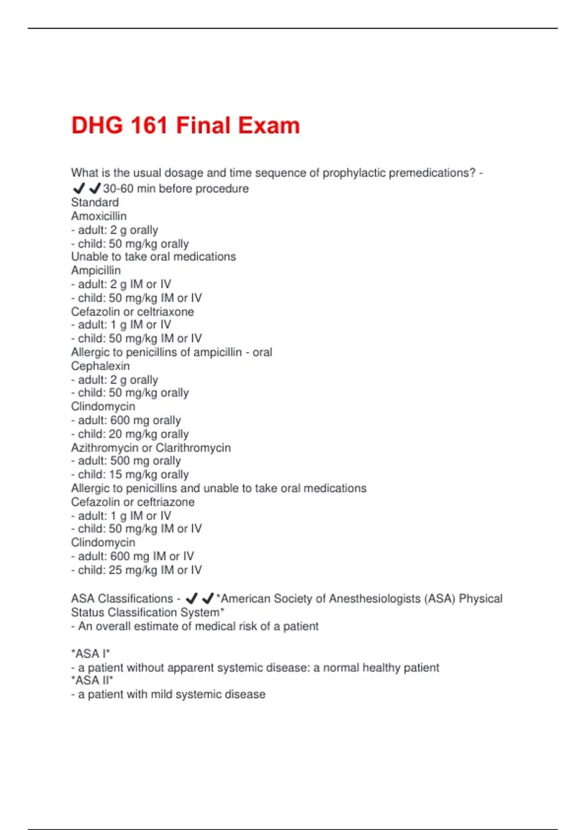 What is the usual dosage and time sequence of prophylactic premedications? - ️️30-60 min before procedure Standard Amoxicillin - adult: 2 g orally - child: 50 mg/kg orally Unable to take oral medications Ampicillin - adult: 2 g IM or IV - child: 50 mg/kg IM or IV Cefazolin or celtriaxone - adult: 1 g IM or IV - child: 50 mg/kg IM or IV Allergic to penicillins of ampicillin - oral Cephalexin - adult: 2 g orally - child: 50 mg/kg orally Clindomycin - adult: 600 mg orally - child: 20 mg/kg orally Azithromycin or Clarithromycin - adult: 500 mg orally - child: 15 mg/kg orally Allergic to penicillins and unable to take oral medications Cefazolin or ceftriazone - adult: 1 g IM or IV - child: 50 mg/kg IM or IV Clindomycin - adult: 600 mg IM or IV - child: 25 mg/kg IM or IV ASA Classifications - ️️*American Society of Anesthesiologists (ASA) Physical Status Classification System* - An overall estimate of medical risk of a patient *ASA I* - a patient without apparent systemic disease: a normal healthy patient *ASA II* - a patient with mild systemic disease*ASA III* - a patient with severe systemic disease that limits activity but is not incapacitating *ASA IV* - a patient with an incapacitating systemic disease that is a constant threat to life *ASA V* - a moribund patient not expected to survive 24 hours with ot without care