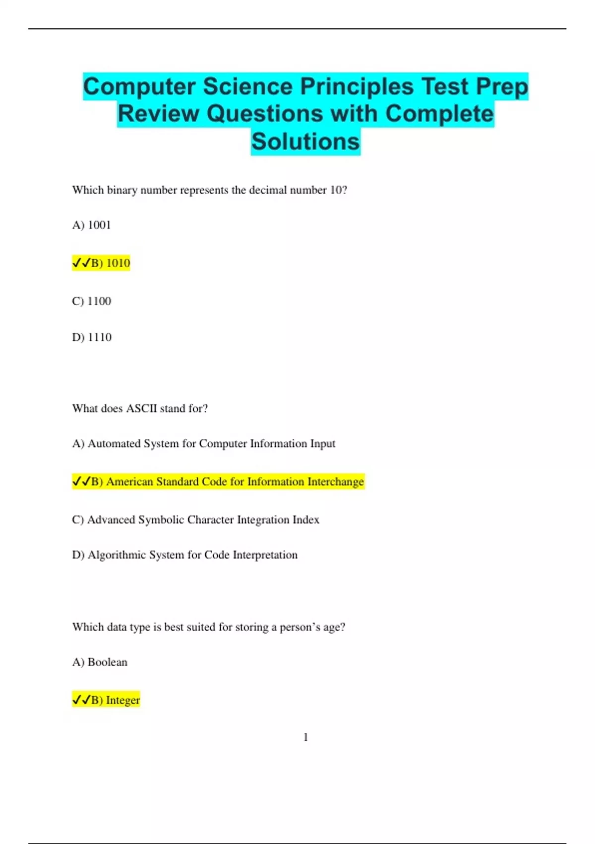 Computer Science Principles Test Prep Review Questions with Complete Solutions Which binary number represents the decimal number 10? A) 1001 B) 1010 C) 1100 D) 1110 What does ASCII stand for? A) Automated System for Computer Information Input B) American Standard Code for Information Interchange C) Advanced Symbolic Character Integration Index D) Algorithmic System for Code Interpretation Which data type is best suited for storing a person’s age? A) Boolean B) Integer 2 C) String D) Array What is the primary purpose of an algorithm? A) To provide a step-by-step solution to a problem B) To store data efficiently C) To enhance graphics on a screen D) To generate random numbers Which of the following is an example of a high-level programming language? A) Assembly B) Machine Code C) Python D) Binary What does "HTTP" stand for in web development? A) Hypertext Transfer Protocol B) High-Level Transfer Process 3 C) Hyperlink Transmission Path D) Host Transfer Technology Protocol Which data structure uses First-In, First-Out (FIFO) ordering? A) Stack B) Queue C) Tree D) Graph What is the main function of the CPU? A) Store long-term data B) Process instructions and perform calculations C) Control display output D) Manage internet connections Which logic gate returns true only when both inputs are true? A) OR B) XOR 4 C) AND D) NOR What does a compiler do? A) Translates high-level code into English