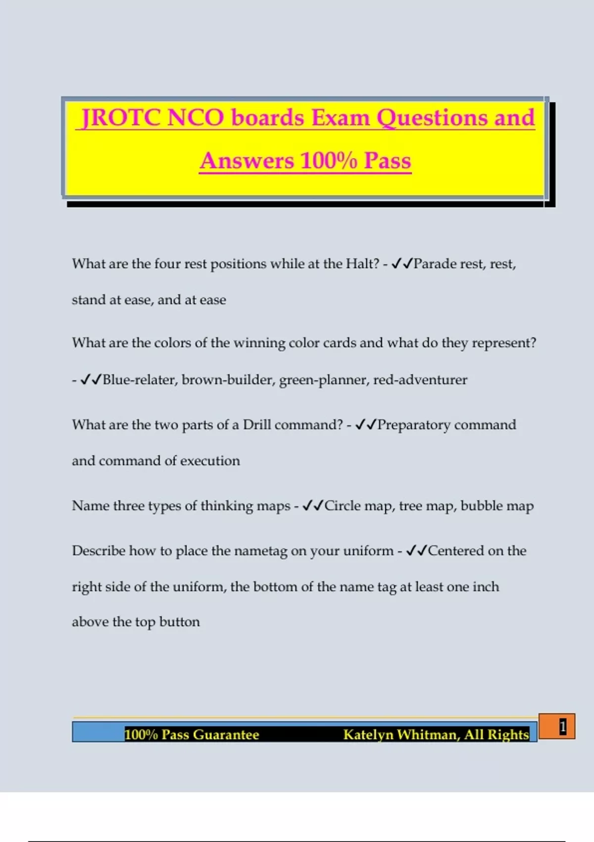 JROTC NCO boards Exam Questions and Answers 100% Pass What are the four rest positions while at the Halt? - Parade rest, rest, stand at ease, and at ease What are the colors of the winning color cards and what do they represent? - Blue-relater, brown-builder, green-planner, red-adventurer What are the two parts of a Drill command? - Preparatory command and command of execution Name three types of thinking maps - Circle map, tree map, bubble map Describe how to place the nametag on your uniform - Centered on the right side of the uniform, the bottom of the name tag at least one inch above the top button 2 100% Pass Guarantee Katelyn Whitman, All Rights What are the three branches of the US government? - Executive, Legislative, Judicial What is the MISSION of JROTC? - To motivate young people to be better citizens What are the three types of most commonly displayed US flags? - Garrison, post, and storm What are three ways to pay respect to the United States flag? - Reciting the Pledge of Allegiance, saluting the flag, properly folding the flag DAI - LTC Bill Brooks SAI - COL Glass What is the supreme law of the land? - US constitu