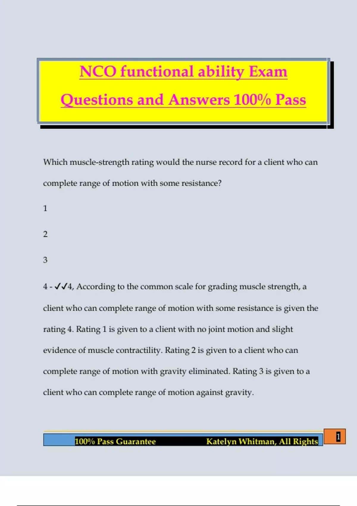 NCO functional ability Exam Questions and Answers 100% Pass Which muscle-strength rating would the nurse record for a client who can complete range of motion with some resistance? 1 2 3 4 - 4, According to the common scale for grading muscle strength, a client who can complete range of motion with some resistance is given the rating 4. Rating 1 is given to a client with no joint motion and slight evidence of muscle contractility. Rating 2 is given to a client who can complete range of motion with gravity eliminated. Rating 3 is given to a client who can complete range of motion against gravity. 2 100% Pass Guarantee Katelyn Whitman, All Rights Which term describes synovial joint movement away from the midline of the body? 1 Inversion 2 Extension 3 Pronation 4 Abduction - 4, abduction Which organ is commonly affected in children with juvenile idiopathic arthritis (JIA)? 1 Ears 2 3 100% Pass Guarantee Katelyn Whitman, All Rights Eyes 3 Liver 4 Brain - 2 eyes Which joint is an example of a condyloid joint? 1 Wrist joint 2 Elbow joint 3 Shoulder joint 4 Sacroiliac joint - Wrist, specific joint above carpals 4 100% Pass Guarantee Katelyn Whitman, All Rights Which bursae are between the client's elbow and the skin? 1 Olecranon 2 Prepatellar 3 Subacromial 4 Trochanteric - 1 olecranon