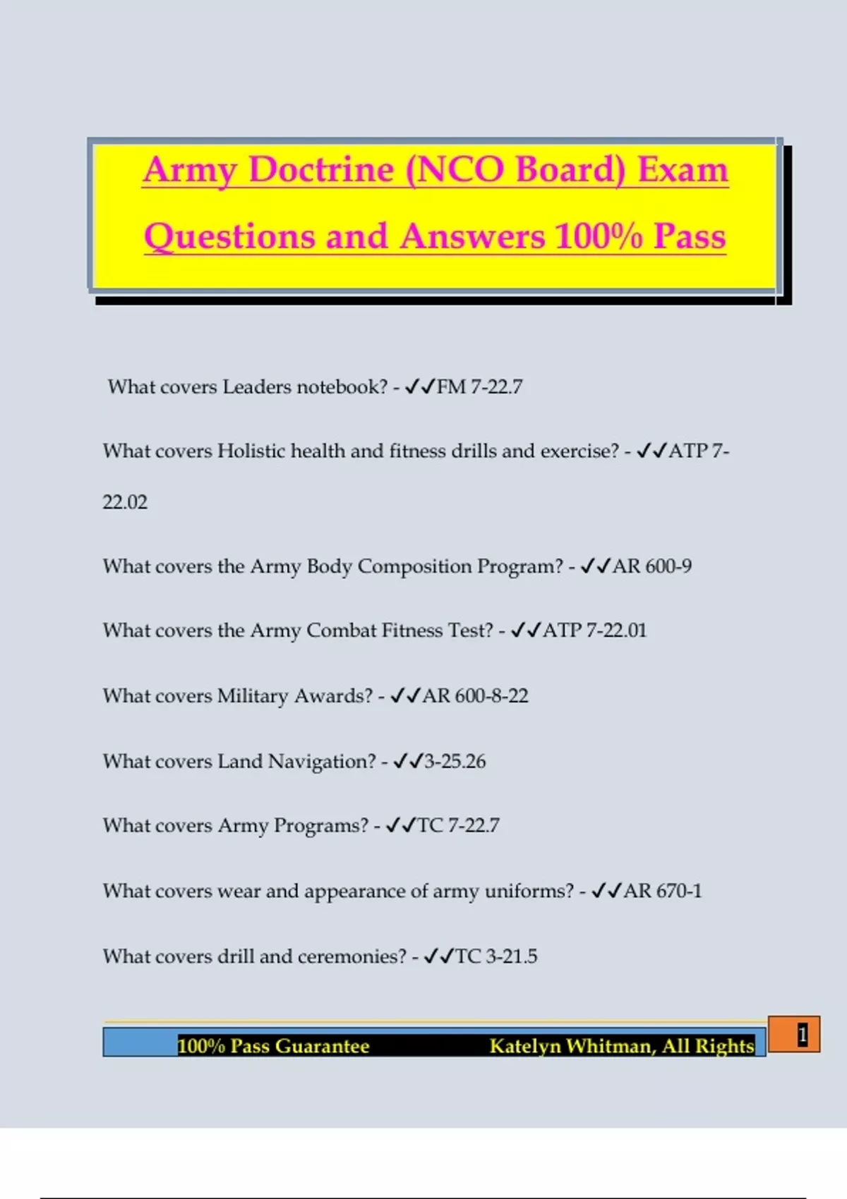 Army Doctrine (NCO Board) Exam Questions and Answers 100% Pass What covers Leaders notebook? - FM 7-22.7 What covers Holistic health and fitness drills and exercise? - ATP 7- 22.02 What covers the Army Body Composition Program? - AR 600-9 What covers the Army Combat Fitness Test? - ATP 7-22.01 What covers Military Awards? - AR 600-8-22 What covers Land Navigation? - 3-25.26 What covers Army Programs? - TC 7-22.7 What covers wear and appearance of army