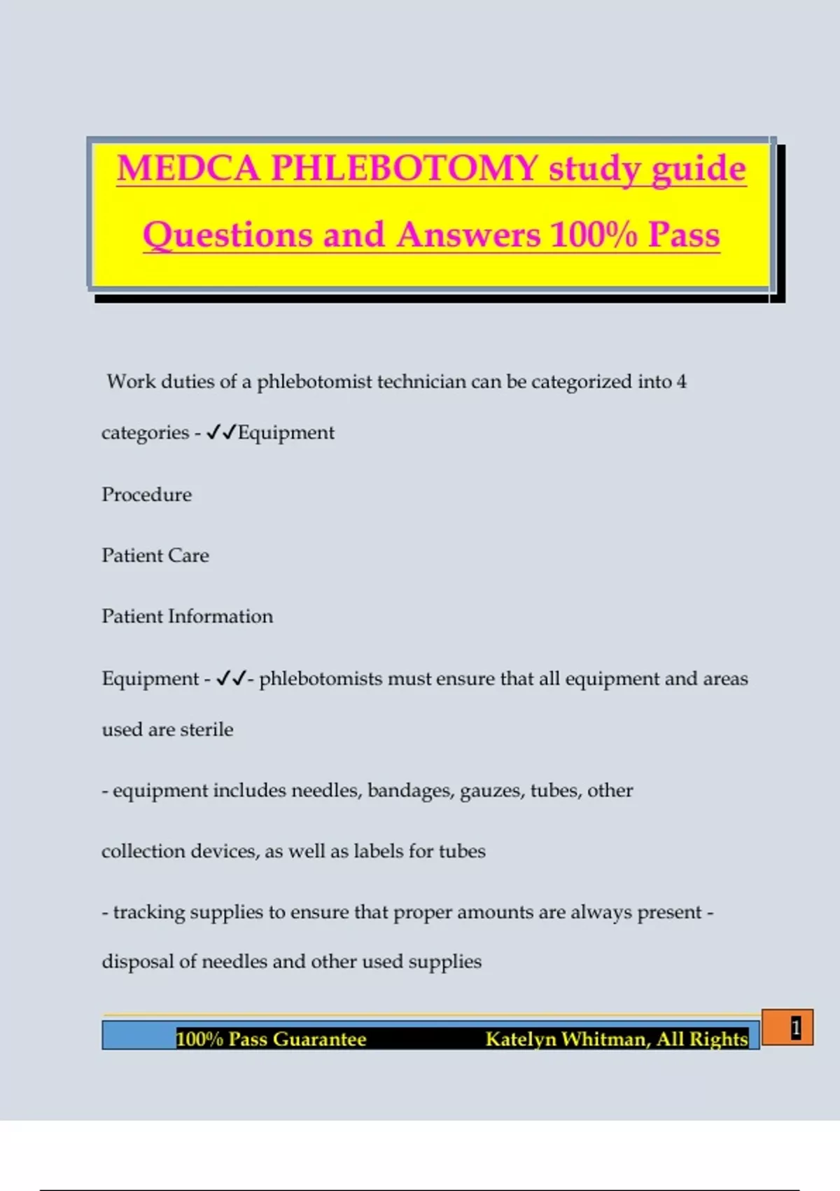 MEDCA PHLEBOTOMY study guide Questions and Answers 100% Pass Work duties of a phlebotomist technician can be categorized into 4 categories - Equipment Procedure Patient Care Patient Information Equipment - - phlebotomists must ensure that all equipment and areas used are sterile - equipment includes needles, bandages, gauzes, tubes, other collection devices, as well as labels for tubes - tracking supplies to ensure that proper amounts are always present - disposal of needles and other used supplies 2 100% Pass Guarantee Katelyn Whitman, All Rights Procedure - - correct puncture or incision of patient's skin - collecting the correct amount of blood or other fluids - correct labeling of collection tubes/devices - completing and submitting documents needed to lab Patient Care - - reassuring patients, as some may have fear of needles - being able to answer questions that patients may have - verifying patient information to ensure accuracy of tests or procedure - monitoring patient during procedure to prevent movement or fainting Patient Information - - patients' rights must be respected - keeping patients' medical records confidential - accurate documentation of collection, ordered tests, and test results - providing accurate documentation to the laboratory to ensure performance of tests ordered by physician Quality Improvement Methods - Include the use of data-based methods in order to reach improvement 3 100% Pass Guarantee Katelyn Whitman, All Rights Include flow charts and pareto charts Flowchart - - used to break out components into diagrams in order to understand a process Pareto Chart - - bar charts are made that show the frequency of problems What does quality improvement for specimen collection involve? - Technique of Phlebotomist Frequency of hematoma Recollection Rates What is included in quality control records - Expiration Date Stability Information Storage Information Proper Use Precision of testing supplies/reagents 4 100% Pass Guarantee Katelyn Whitman, All Rights Accuracy of testing supplies/reagents Where can phlebotomists work? - Hospital Clinic Doctor's office Laboratories Blood Banks Research Firms Pharmaceutical Firms Hospital - institution which provides medical and surgical treatment Clinic - institution or hospital department
