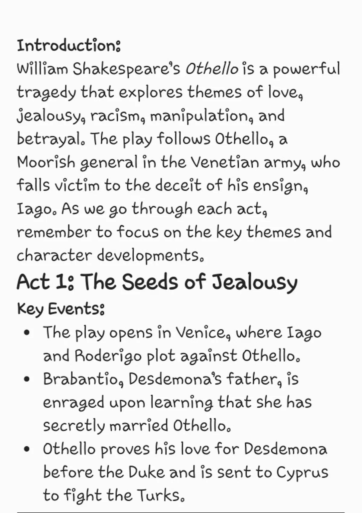This document gives a full breakdown of each act in Othello. It also gives you important points to make the drama Othello better to understand.