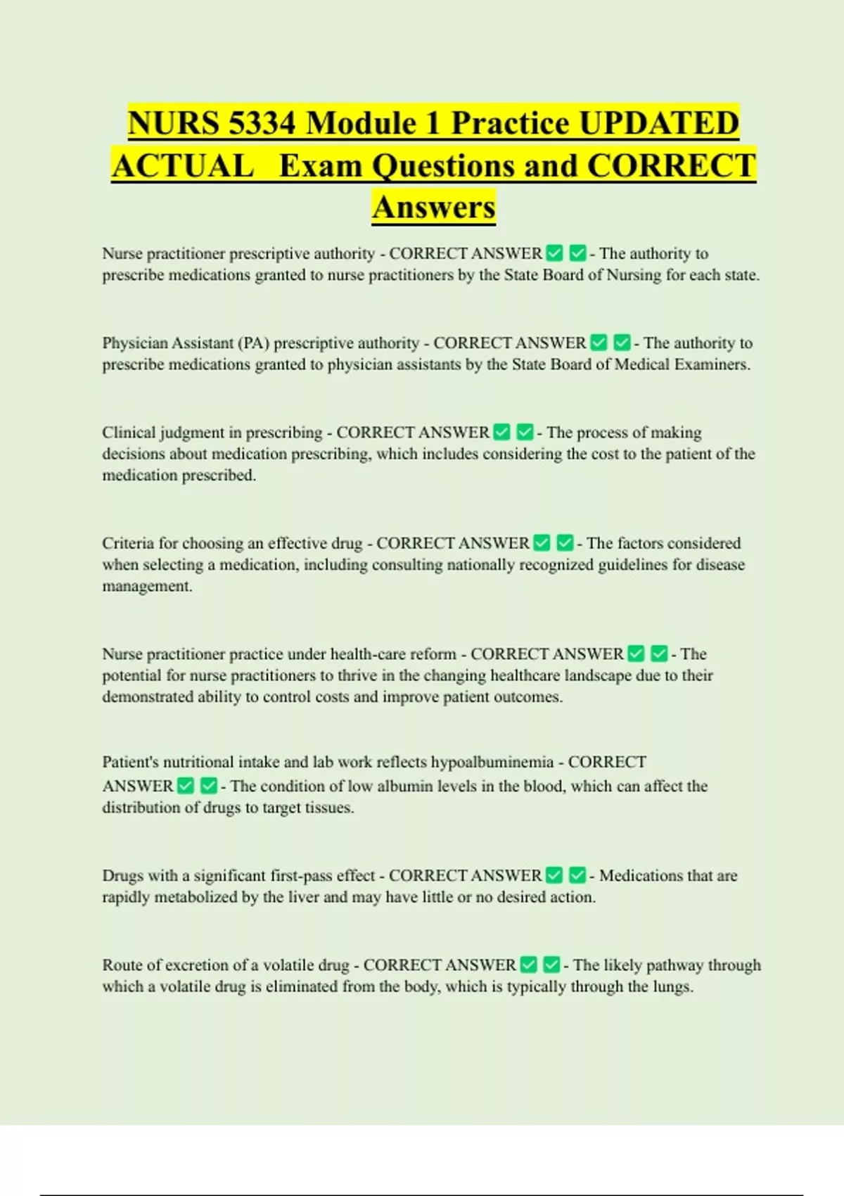 NURS 5334 Module 1 Practice UPDATED ACTUAL Exam Questions and CORRECT Answers Nurse practitioner prescriptive authority - CORRECT ANSWER - The authority to prescribe medications granted to nurse practitioners by the State Board of Nursing for each state. Physician Assistant (PA) prescriptive authority - CORRECT ANSWER - The authority to prescribe medications granted to physician assistants by the State Board of Medical Examiners.