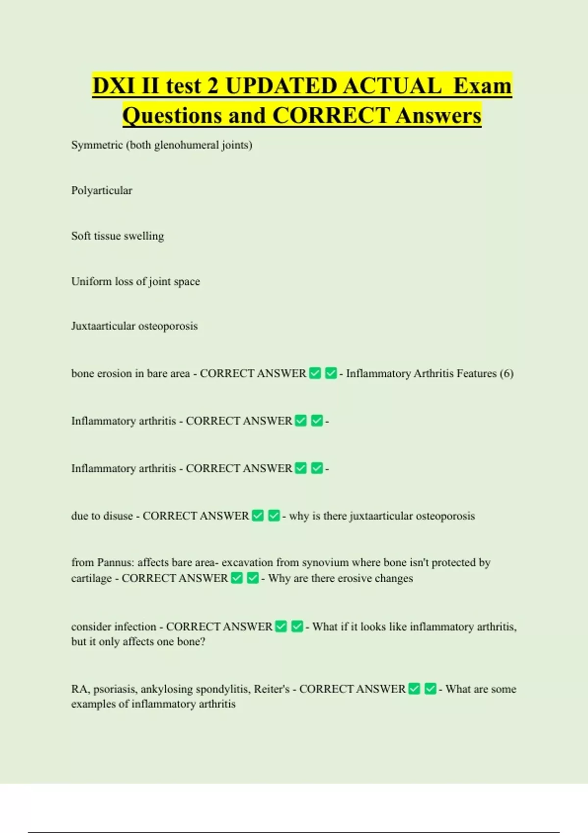 DXI II test 2 UPDATED ACTUAL Exam Questions and CORRECT Answers Symmetric (both glenohumeral joints) Polyarticular Soft tissue swelling Uniform loss of joint space Juxtaarticular osteoporosis bone erosion in bare area - CORRECT ANSWER Inflammatory arthritis - CORRECT ANSWER Inflammatory arthritis - CORRECT ANSWER due to disuse - CORRECT ANSWER - Inflammatory Arthritis Features (6