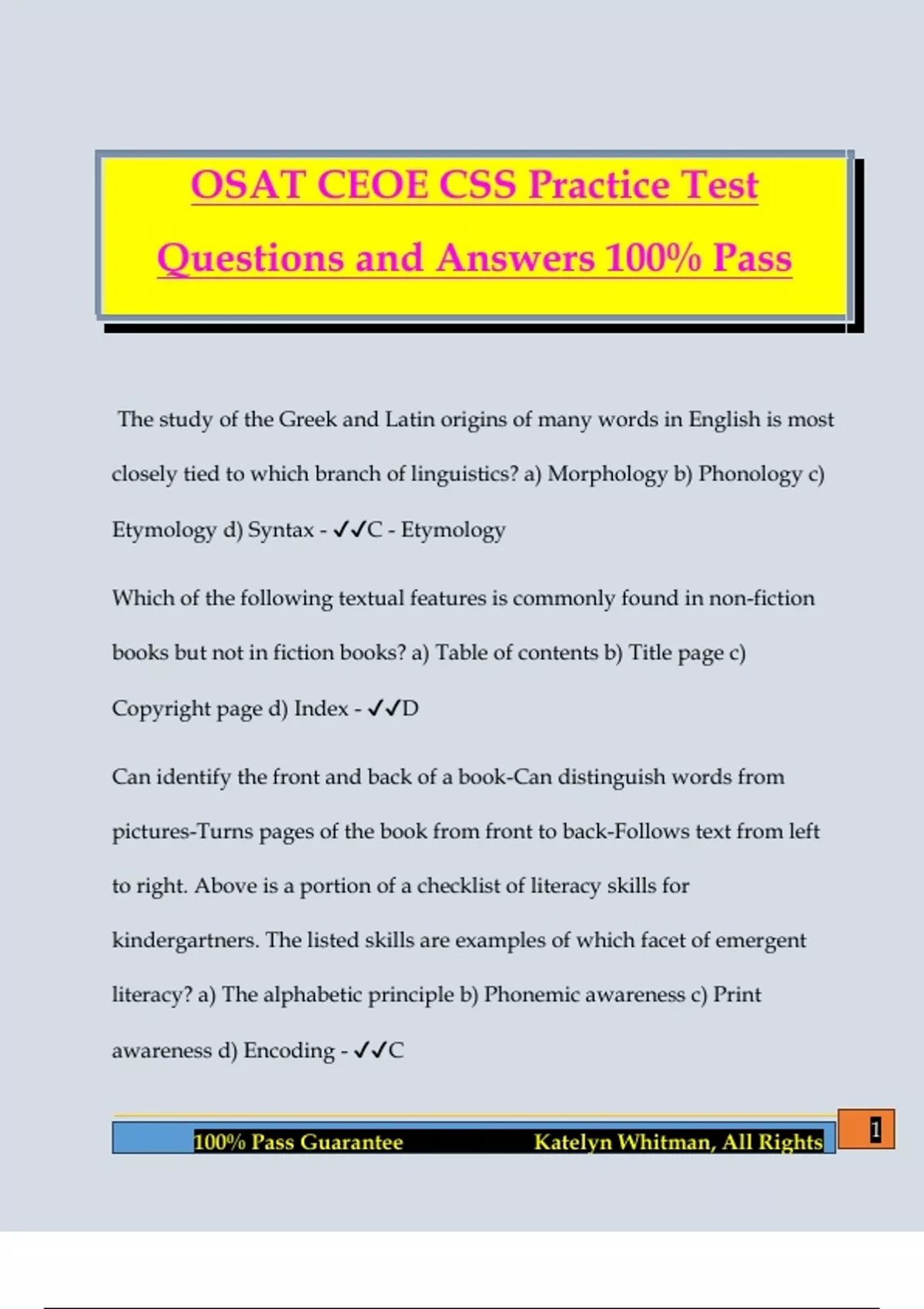 OSAT CEOE CSS Practice Test Questions and Answers 100% Pass The study of the Greek and Latin origins of many words in English is most closely tied to which branch of linguistics? a) Morphology b) Phonology c) Etymology d) Syntax - C - Etymology Which of the following textual features is commonly found in non-fiction books but not in fiction books? a) Table of contents b) Title page c) Copyright page d) Index - D Can identify the front and back of a book-Can distinguish words from pictures-Turns pages of the book from front to back-Follows text from left to right. Above is a portion of a checklist of literacy skills for kindergartners. The listed skills are examples of which facet of emergent literacy? a) The alphabetic principle b) Phonemic awareness c) Print awareness d) Encoding - C 2 100% Pass Guarantee Katelyn Whitman, All Rights For children under the age of five, the acquisition of a second language is typically a) considered a form of successive bilingualism b) more difficult than it is for older children who have already learned to read in their first language c) very similar to the process of acquiring the first language d) not encouraged yet so as not to confuse the child, who is still working to become proficient in his or her first language - C Syllabication requires which of the following skills? a) Phoneme isolation b) Phoneme substitution c) Decoding d) Letter-sound correspondence. - A A student completes an oral reading fluency assessment as his teacher keeps a running record. Which of the following statements refers to the student's automaticity? a) The student read with 97% accuracy. b) The student slowed to decode unfamiliar words four times during the assessment.c) The student read at a rate of 39 words correct per minute. d) The student used appropriate vocal inflections for punctuation marks such as question marks and commas. - B 3 100% Pass Guarantee Katelyn Whitman, All Rights "Following the upheaval of the Civil War, many Southerners wanted to restore their antebellum way of life." A student unfamiliar with the word antebellum in the sentence above could find out its meaning using any of the following EXCEPT: a) knowledge of root words b) knowledge of suffixes c) a dictionary d) context clues - B Which of the following tasks would require students to use critical comprehension of a text? a) Provide a physical description of each of the major characters. b) List the sequence of the major events in the story. c) Describe the story's setting. d) Contrast the character traits of the protagonist and the antagonist. - D "My heart raced as the door gave a long, eerie creak. After an eternity, the door stood fully open to reveal a silhouette, black as the night against the light pouring in from the next room." The passage above contains examples of all of the following literary devices EXCEPT: a) hyperbole b) simile c) alliteration d) onomatopoeia - C