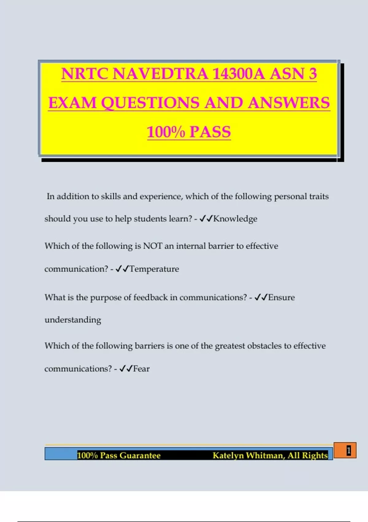 NRTC NAVEDTRA 14300A ASN 3 EXAM QUESTIONS AND ANSWERS 100% PASS In addition to skills and experience, which of the following personal traits should you use to help students learn? - Knowledge Which of the following is NOT an internal barrier to effective communication? - Temperature What is the purpose of feedback in communications? - Ensure understanding Which of the following barriers is one of the greatest obstacles to effective communications? - Fear 2 100% Pass Guarantee Katelyn Whitman, All Rights Listening is an active process that must be learned. Which of the following student responses helps this learning process? - Concentration and attention Raised hands and relevant questions are sure signs of which of the following listening factors? - Effective communication Spoken words alone account for what percentage of the impact of a message? - 7% The use of understandable speech describes which of the following delivery techniques? - Articulation In your instructor delivery, you should avoid which of the following manners of speaking - Mumbling What is the normal words-per-minute rate of speech delivery? - 75 - 100 - Wrong 100 - 125 - Wrong 3 100% Pass Guarantee Katelyn Whitman, All Rights Which of the following elements concerns the correct usage of the spoken or written word? - Grammer Which of the following communication skills involves a change in the normal pitch or tone of your voice? - Inflection Which of the following teaching techniques combines volume with vitality and conviction? - Feedback What is the most powerful element of instructor presence in front of a class? - Direct eye contact