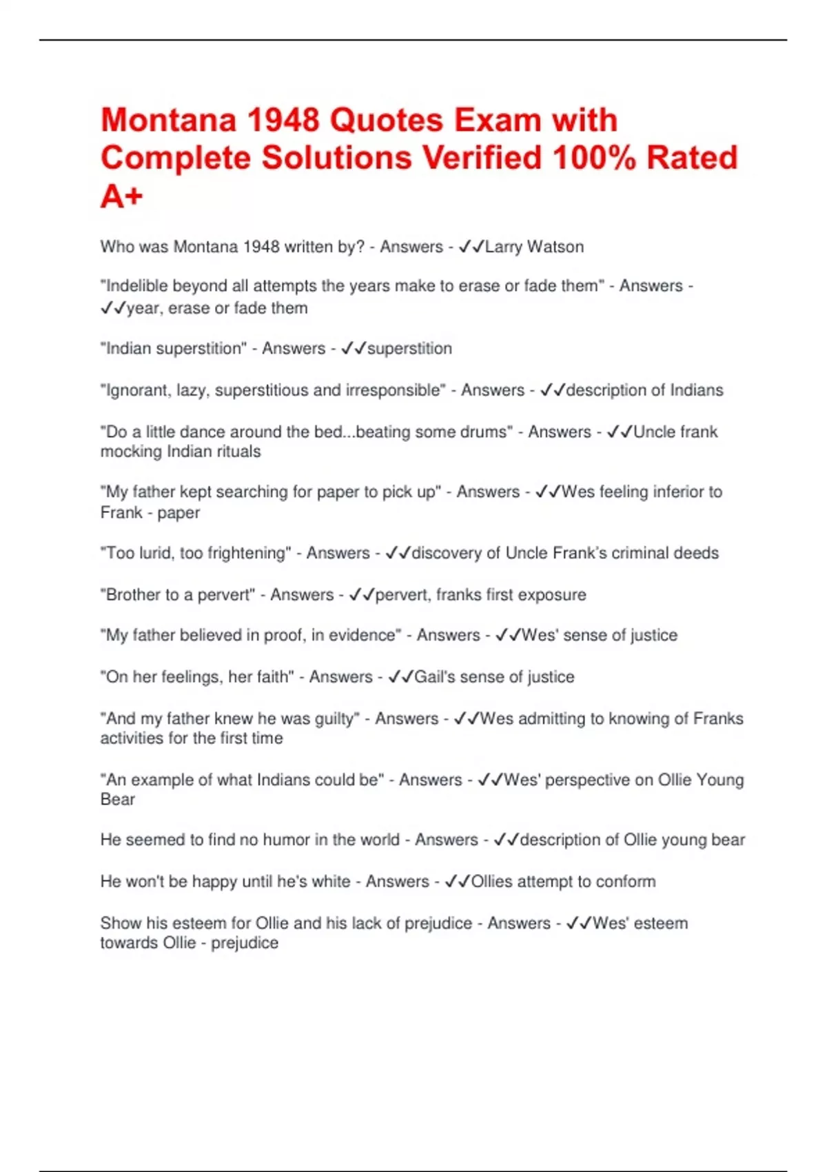 Montana 1948 Quotes Exam with Complete Solutions Verified 100% Rated A+ Who was Montana 1948 written by? - Answers - Larry Watson "Indelible beyond all attempts the years make to erase or fade them" - Answers - year, erase or fade them "Indian superstition" - Answers - superstition "Ignorant, lazy, superstitious and irresponsible" - Answers - description of Indians "Do a little dance around the bed...beating some drums" - Answers - Uncle frank mocking Indian rituals "My father kept searching for paper to pick up" - Answers - Wes feeling inferior to Frank - paper "Too lurid, too frightening" - Answers - discovery of Uncle Frank’s criminal deeds "Brother to a pervert" - Answers - pervert, franks first exposure "My father believed in proof, in evidence" - Answers - Wes' sense of justice "On her feelings, her faith" - Answers - Gail's sense of justice "And my father knew he was guilty" - Answers - Wes admitting to knowing of Franks activities for the first time "An example of what Indians could be" - Answers - Wes' perspective on Ollie Young Bear He seemed to find no humor in the world - Answers - description of Ollie young bear He won't be happy until he's white - Answers - Ollies attempt to conform