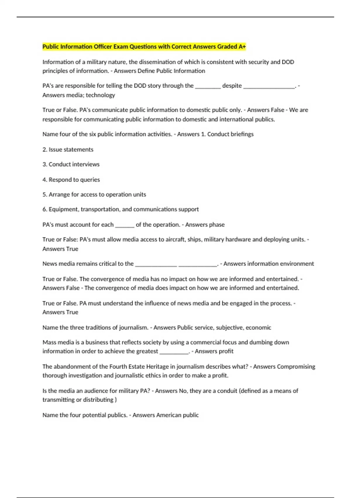 Public Information Officer Exam Questions with Correct Answers Graded A+ Information of a military nature, the dissemination of which is consistent with security and DOD principles of information. - Answers Define Public Information PA's are responsible for telling the DOD story through the ________ despite ________________. - Answers media; technology True or False. PA's communicate public information to domestic public only. - Answers False - We are responsible for communicating public information to domestic and international publics. Name four of the six public information activities. - Answers 1. Conduct briefings 2. Issue statements 3. Conduct interviews 4. Respond to queries 5. Arrange for access to operation units 6. Equipment, transportation, and communications support PA's must account for each ______ of the operation. - Answers phase True or False: PA's must allow media access to aircraft, ships, military hardware and deploying units. - Answers True News media remains critical to the _____________ ____________. - Answers information environment True or False. The convergence of media has no impact on how we are informed and entertained. - Answers False - The convergence of media does impact on how we are informed and entertained. True or False. PA must understand the influence of news media and be engaged in the process. - Answers True Name the three traditions of journalism. - Answers Public service, subjective, economic Mass media is a business that reflects society by using a commercial focus and dumbing down information in order to achieve the greatest _________. - Answers profit The abandonment of the Fourth Estate Heritage in journalism describes what? - Answers Compromising thorough investigation and journalistic ethics in order to make a profit. Is the media an audience for military PA? - Answers No, they are a conduit (defined as a means of transmitting or distributing ) Name the four potential publics. - Answers American public International public (through media)