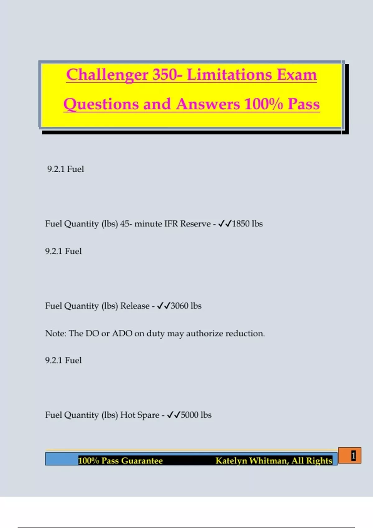 Challenger 350- Limitations Exam Questions and Answers 100% Pass 9.2.1 Fuel Fuel Quantity (lbs) 45- minute IFR Reserve - 1850 lbs 9.2.1 Fuel Fuel Quantity (lbs) Release - 3060 lbs Note: The DO or ADO on duty may authorize reduction. 9.2.1 Fuel Fuel Quantity (lbs) Hot Spare - 5000 lbs 2 100% Pass Guarantee Katelyn Whitman, All Rights Note: The DO or ADO on duty may authorize reduction. 9.2.1 Fuel Fuel Quantity (lbs) Emergency - 1300 lbs 9.2.2 (N) Runway for Release Runway Requirements (ft) - Minimum Dry Length - 4000 ft Note 1: minimum distances are required for release only. Upon arrival, pilots may land if the LPA computed distance is less than landing distance available. Note 2: If runway is less than 4,500 ft, it must be dry. 9.2.2 (N) Runway for Release Runway Requirements (ft) 3 100% Pass Guarantee Katelyn Whitman, All Rights - Minimum Width - 70 ft 9.2.2 (N) Runway for Release Max Slope (+/-) - 2% 9.2.2(N) Runway Restrictions Ocean Reef (07FA) Runway Requirements (Exceptions) - Length - 4451 ft Width - 70 ft > Day / Dry only - No rain at Airport > Landing runway 5 ONLY > CP approval per flight 4 100% Pass Guarantee Katelyn Whitman, All Rights > Max crosswind- 10 KTYS > No tailwind > ACP approval required per flight 9.2.2(N) Runway Restrictions Roadtown, BVI (TUPJ) Runway Requirements (Exceptions) - > Day only > Departures dry only > ACP approval required per flight 9.2.3 Crosswind Limitations (NWS operative) Dry or Wet Runway Takeoff_____ 5 100% Pass Guarantee Katelyn Whitman, All Rights Landing_____ Contaminated RWY Width >=150 ft _____ <=149 ft _____ - Crosswind Limitations (NWS operative) Dry or Wet Runway Takeoff - 28 kts Landing - 24 kts Contaminated RWY Width >= 150 ft - 15 kts <= 149 ft - 10 kts 9.2.3 Crosswind Limitations