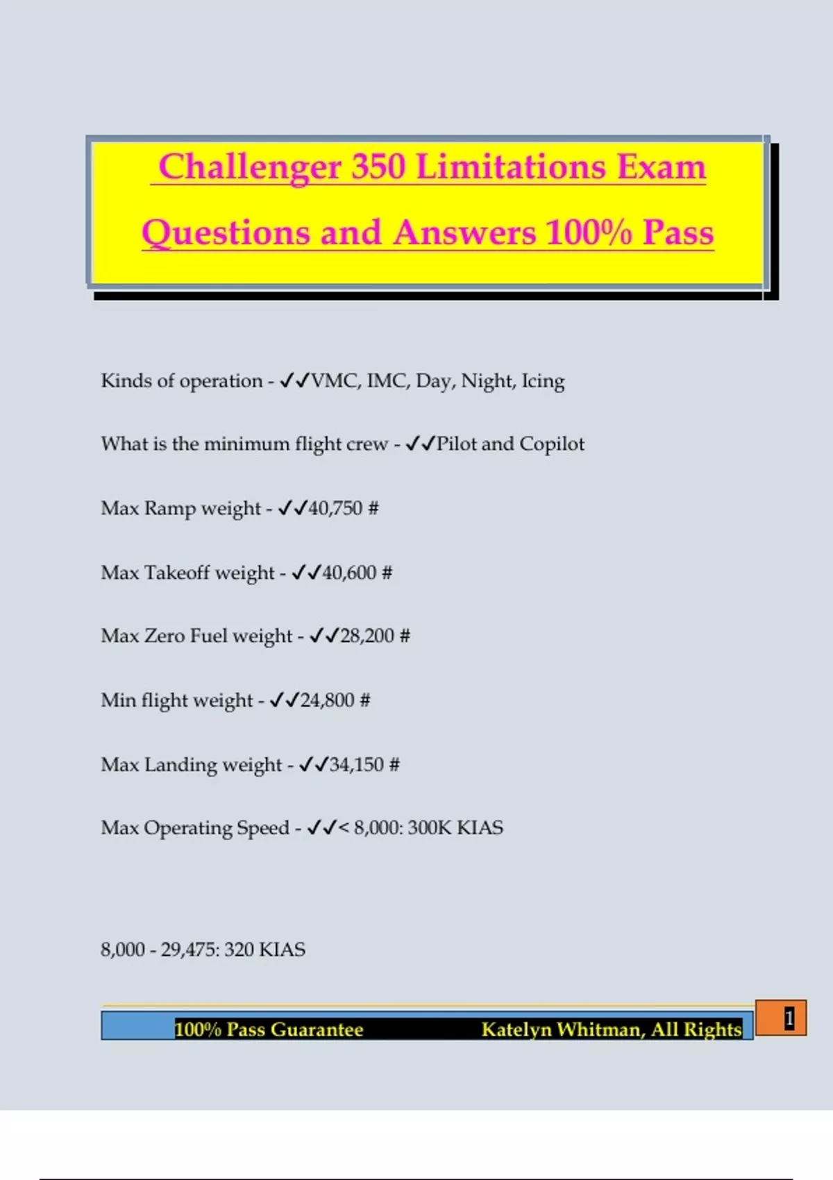 Challenger 350 Limitations Exam Questions and Answers 100% Pass Kinds of operation - VMC, IMC, Day, Night, Icing What is the minimum flight crew - Pilot and Copilot Max Ramp weight - 40,750 # Max Takeoff weight - 40,600 # Max Zero Fuel weight - 28,200 # Min flight weight - 24,800 # Max Landing weight - 34,150 # Max Operating Speed - < 8,000: 300K KIAS 8,000 - 29,475: 320 KIAS 2 100% Pass Guarantee Katelyn Whitman, All Rights > 29,475: 0.83 Rough air penetration - 265 KIAS 0.75M Max Landing Gear Operation - Retraction - 200 KIAS Max Landing Gear Operation - Extension - 250 KIAS Max Landing Gear Operation - Extended - 250 KIAS Max Flap Speed - 10 - 210 KIAS 20 - 210 KIAS 30 - 175 KIAS Max Tire speed - 182 Kts Max Takeoff and Landing pressure altitude - 10,000 Max tailwind - 10kts 3 100% Pass Guarantee Katelyn Whitman, All Rights Max runway slope - +2 degrees, -2 degrees Max Pressure Altitude - FL450 Max maneuvering load factors - Flaps up: +2.6 to -1.0 Flaps down: +2.0 to 0.0 Can you select AIR SOURCE to TRIMAIR ONLY on the groud - No Max differential pressure on the ground - 0.1 psi Max differential pressure during landing - 1.0 psi Max positive differential pressure - 9.4 psi Max negative differential pressure - - 0.5 psi AP min engagement height: Climb, Enroute, Descent